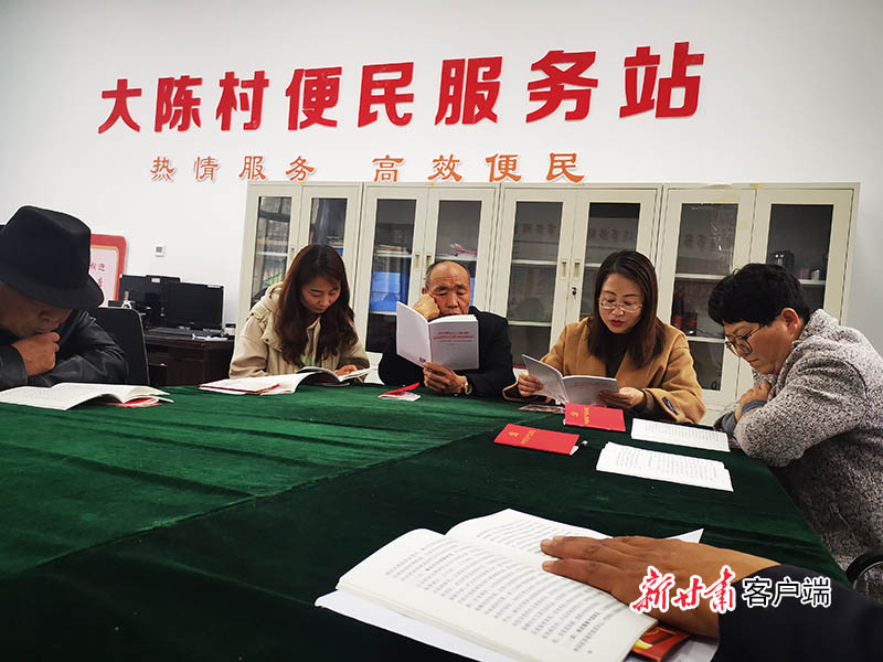 崆峒区文化志愿者和白水镇大陈村党员干部一起学习党的二十大精神。