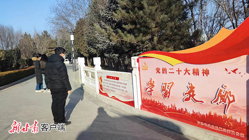 崆峒区市民在新时代文明实践主题公园驻足观看“党的二十大精神学习走廊”。