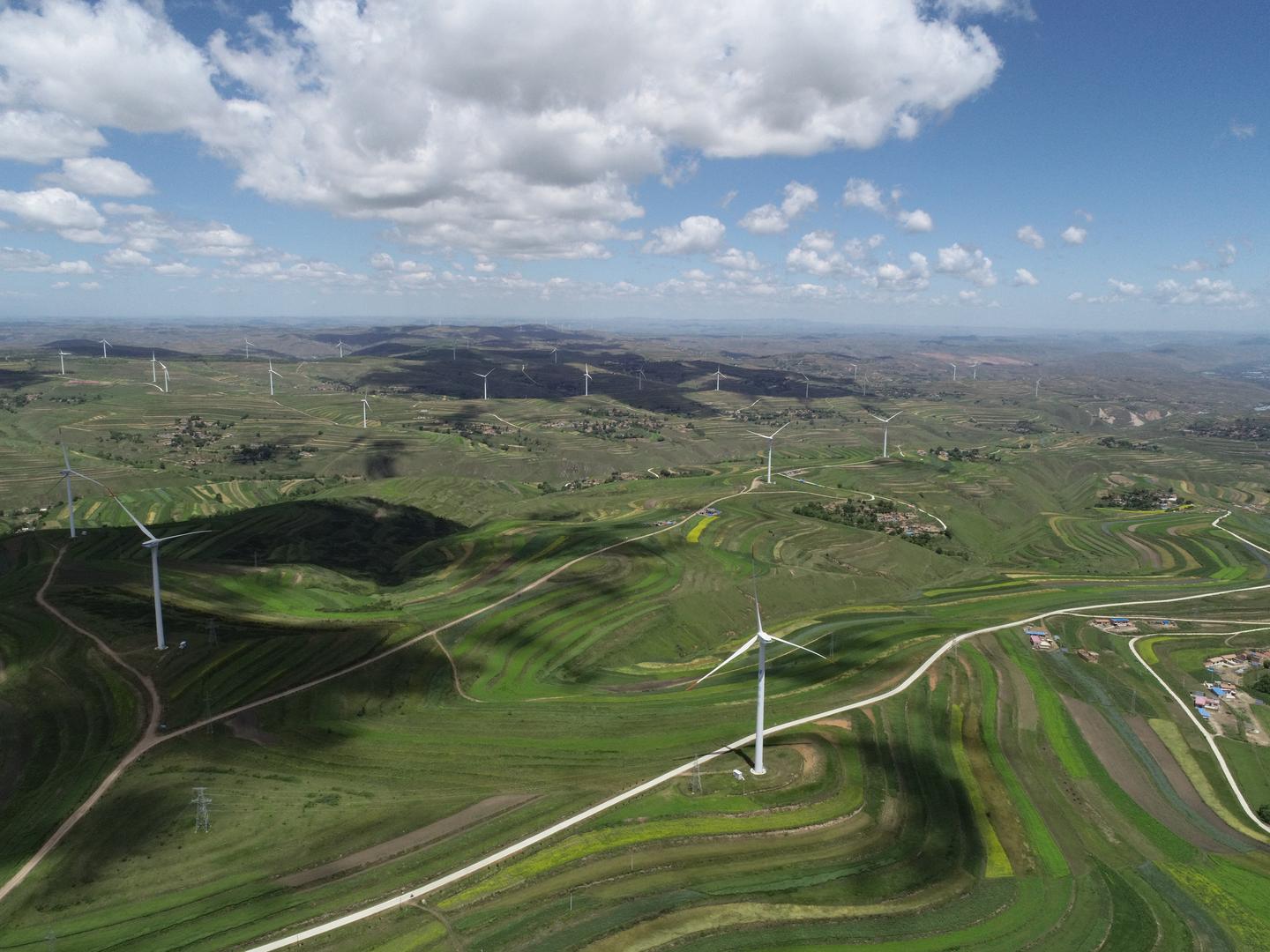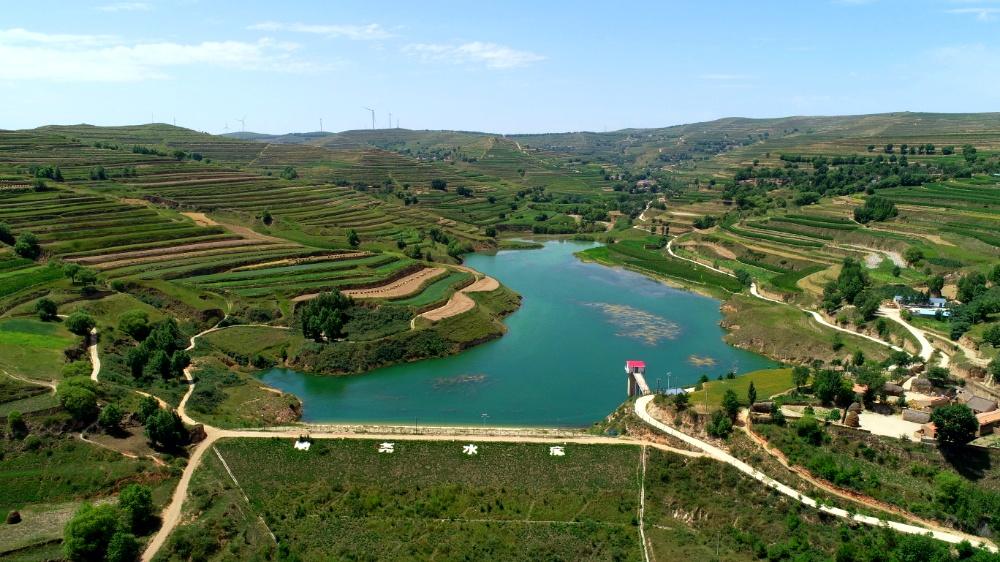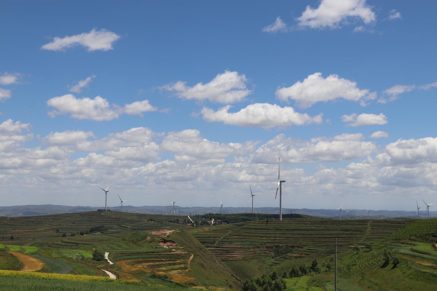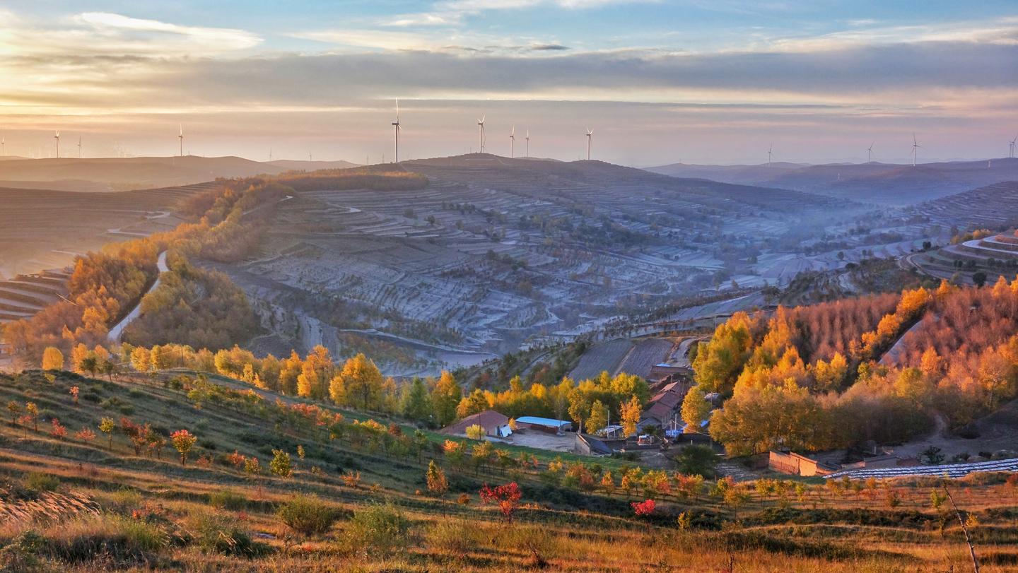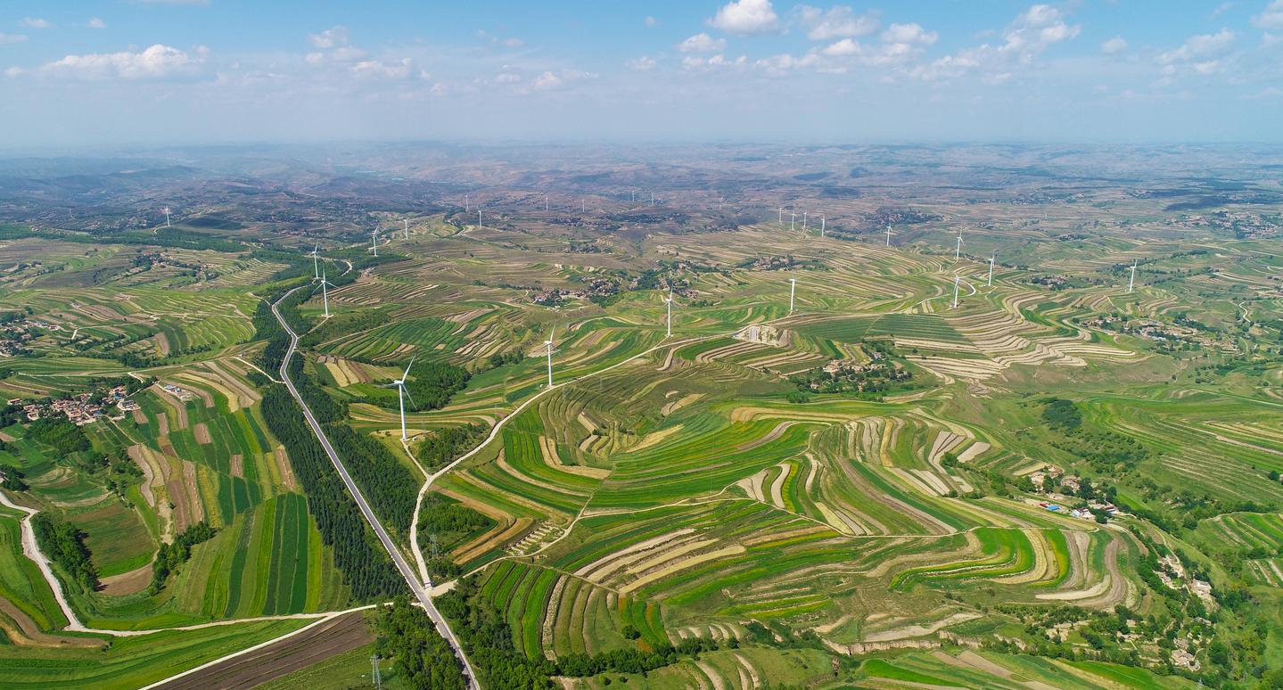 风电机组高耸云端,层层梯田沿山势蜿蜒屈伸,传统村落依山而建、高低不同、错落有致。一眼望去,像梦镜编织的华章,将黄土高原精心描绘成一幅景色迷人的风景画。