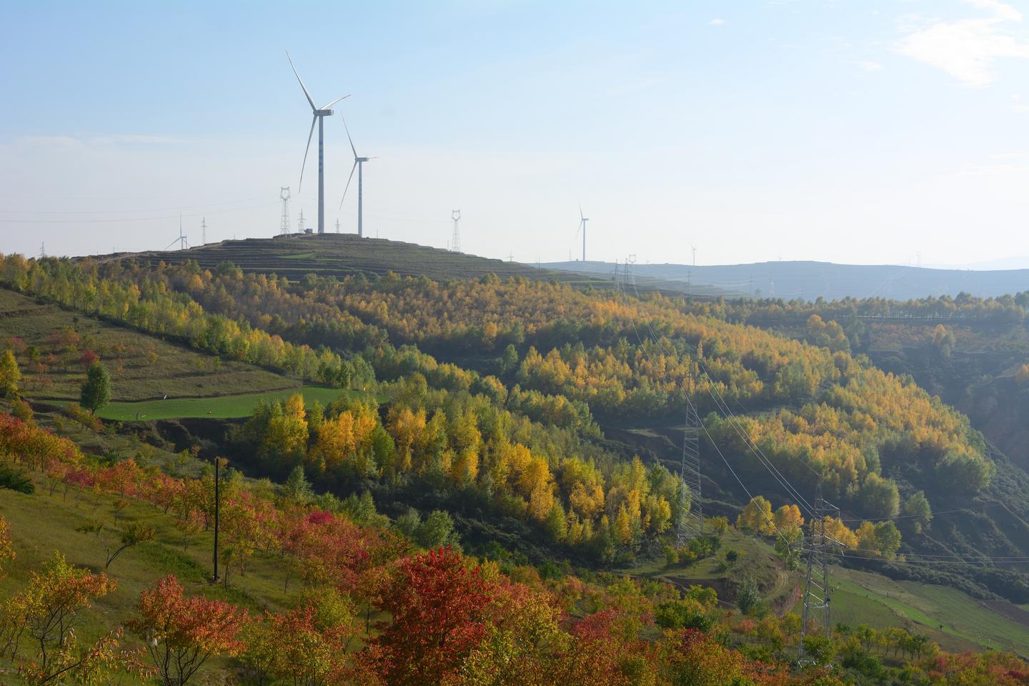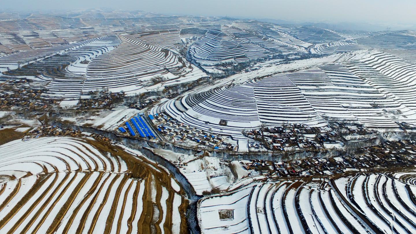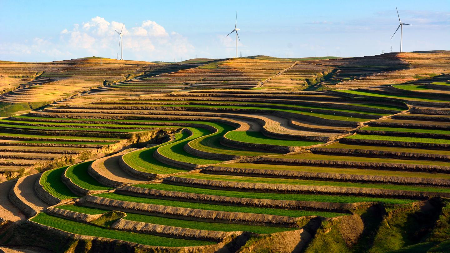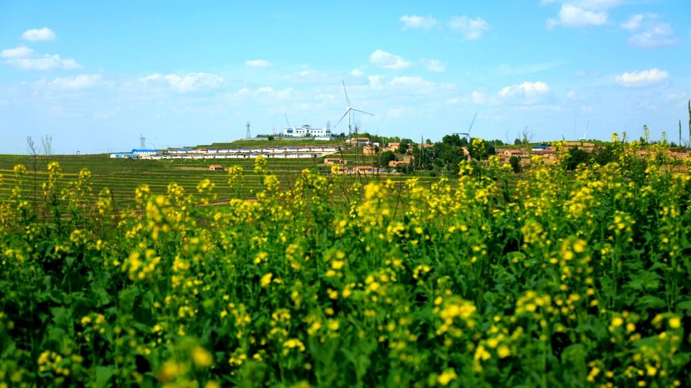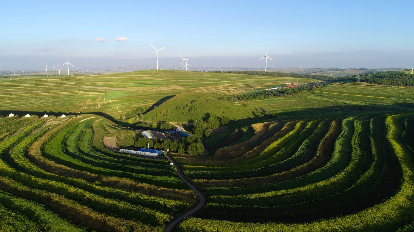 风电机组高耸云端,层层梯田沿山势蜿蜒屈伸,传统村落依山而建、高低不同、错落有致。一眼望去,像梦镜编织的华章,将黄土高原精心描绘成一幅景色迷人的风景画。