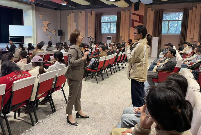 活动现场,胡蓉结合多年工作经历和高校培训实战经验,围绕求职面试中的形象塑造与行为规范展开系统讲解。通过情景模拟、案例分析和互动练习等方式,深入浅出地讲解了职业着装、仪态管理、沟通礼仪等关键环节,帮助学生掌握面试中展现自信得体形象的方法,提升求职竞争力。