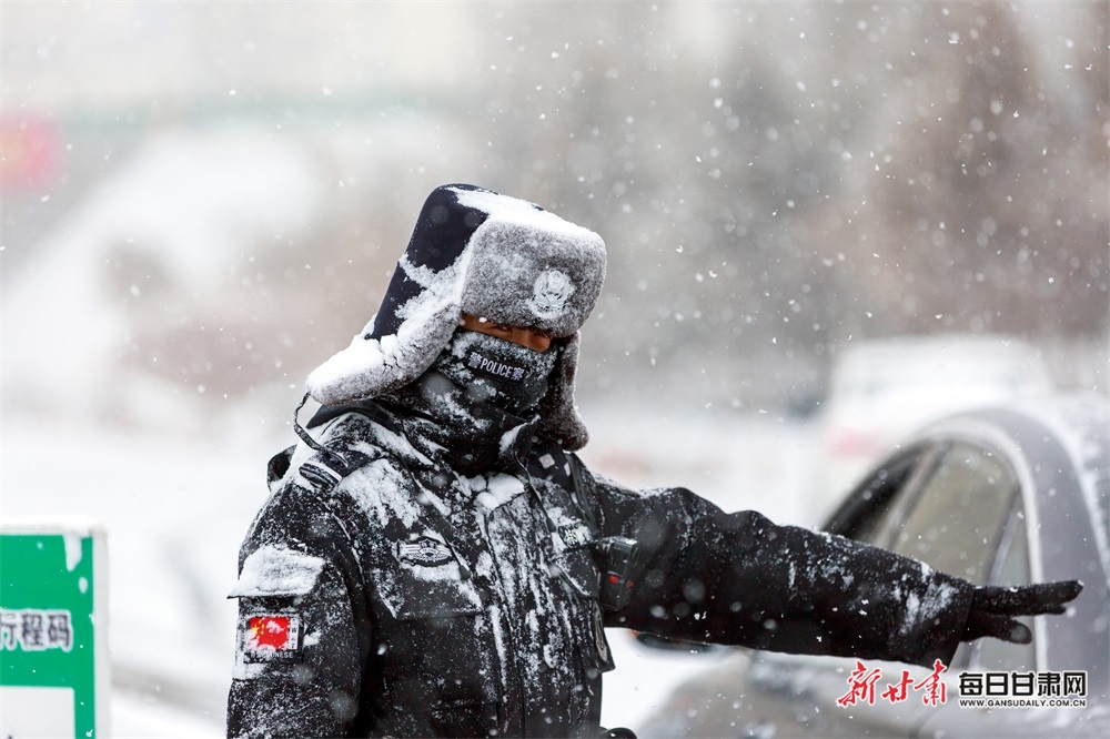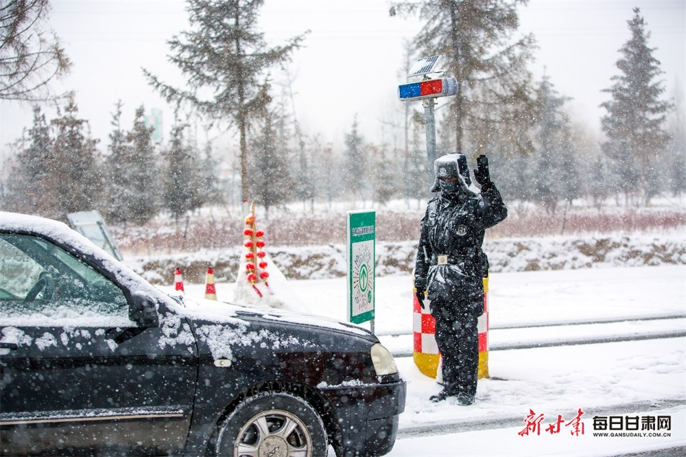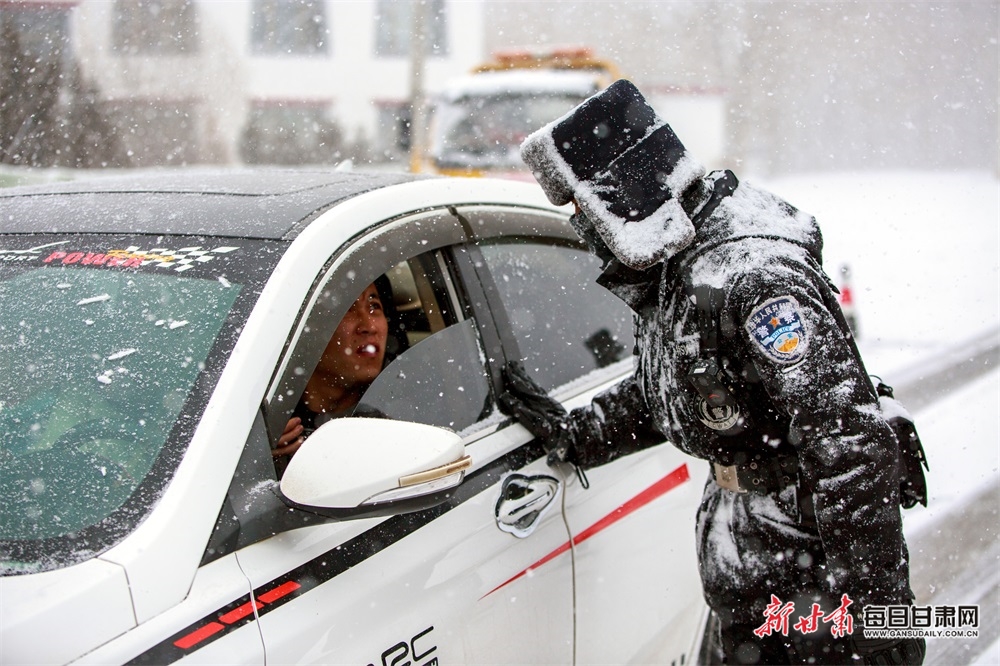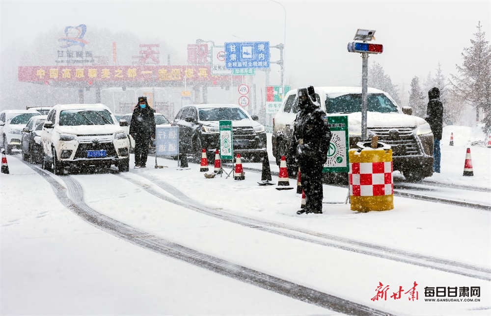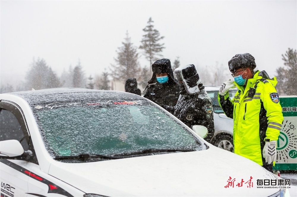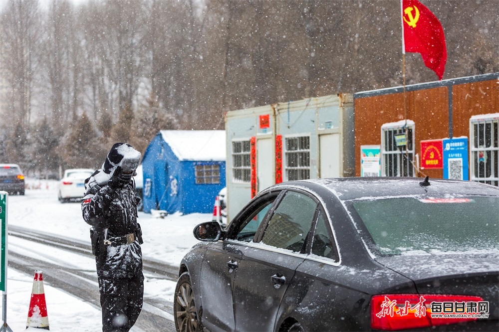 入春以来,天祝县境内飞雪不断,3月27日,在天祝县高速公路,公安民警、医务人员等,在大雪纷飞中正在对进入天祝的车辆驾乘人员进行体温测量、扫码查验等工作。
