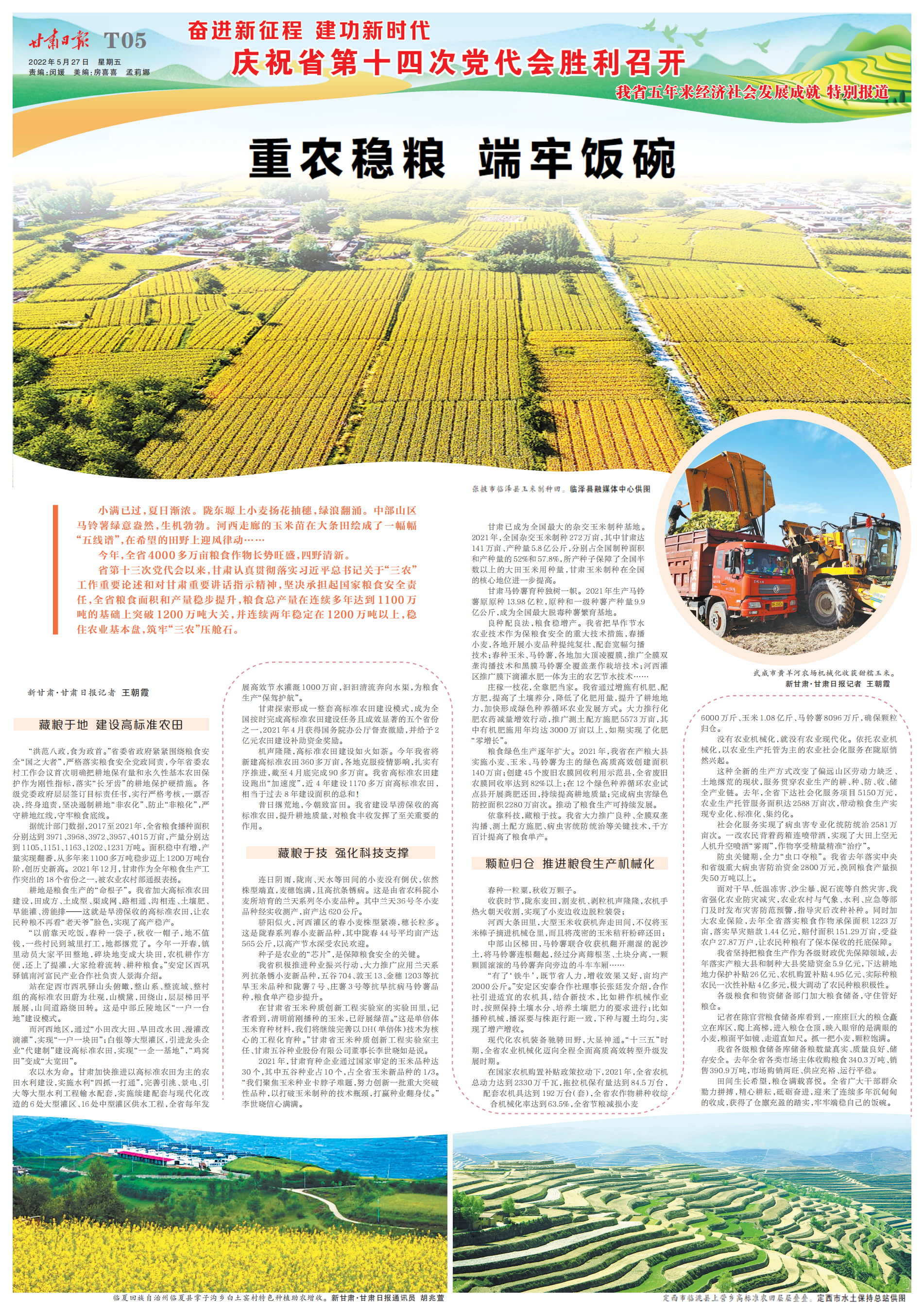 省第十三次党代会以来,甘肃认真贯彻落实习近平总书记关于“三农”工作重要论述和对甘肃重要讲话指示精神,坚决承担起国家粮食安全责任,全省粮食面积和产量稳步提升,粮食总产量在连续多年达到1100万吨的基础上突破1200万吨大关,并连续两年稳定在1200万吨以上,稳住农业基本盘,筑牢“三农”压舱石。