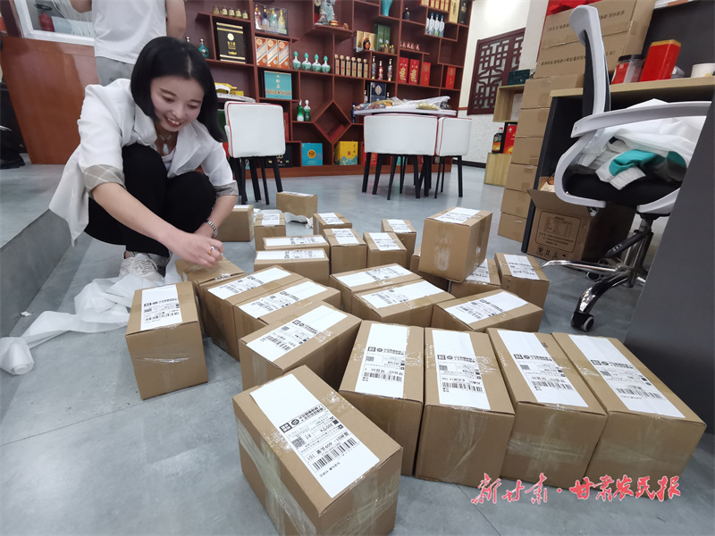 渭源县恒实电商基地工作人员在打包直播带货销售的当地农产品。