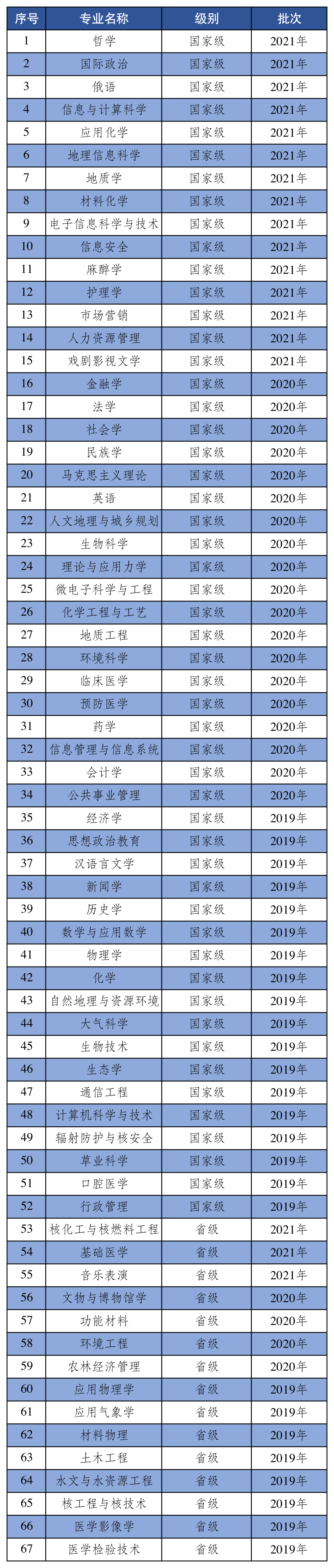 该校生物工程、教育技术学、汉语言文学、绘画、音乐表演5个专业入选国家级一流本科专业建设点;计算机科学与技术、高分子材料与工程、文物与博物馆学3个专业入选省级一流本科专业建设点。目前,该校69个本科招生专业中,国家级、省级一流本科专业建设点增至35个,其中,国家级一流本科专业建设点12个、省级一流专业建设点23个,覆盖理学、工学、农学、医学、法学、教育学、历史学、文学、管理学、艺术学等10个学科门类。