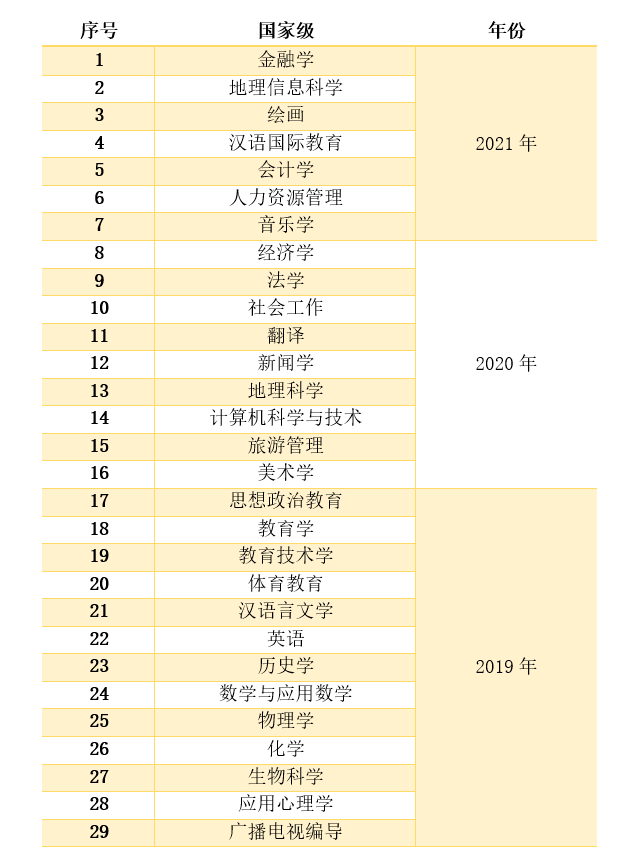 该校地理信息科学、汉语国际教育、绘画、金融学、会计学、人力资源管理、音乐学等7个专业被认定为国家级一流本科专业建设点,舞蹈表演、数字媒体艺术、物联网工程、人文地理与城乡规划等4个专业被认定为省级一流本科专业建设点。