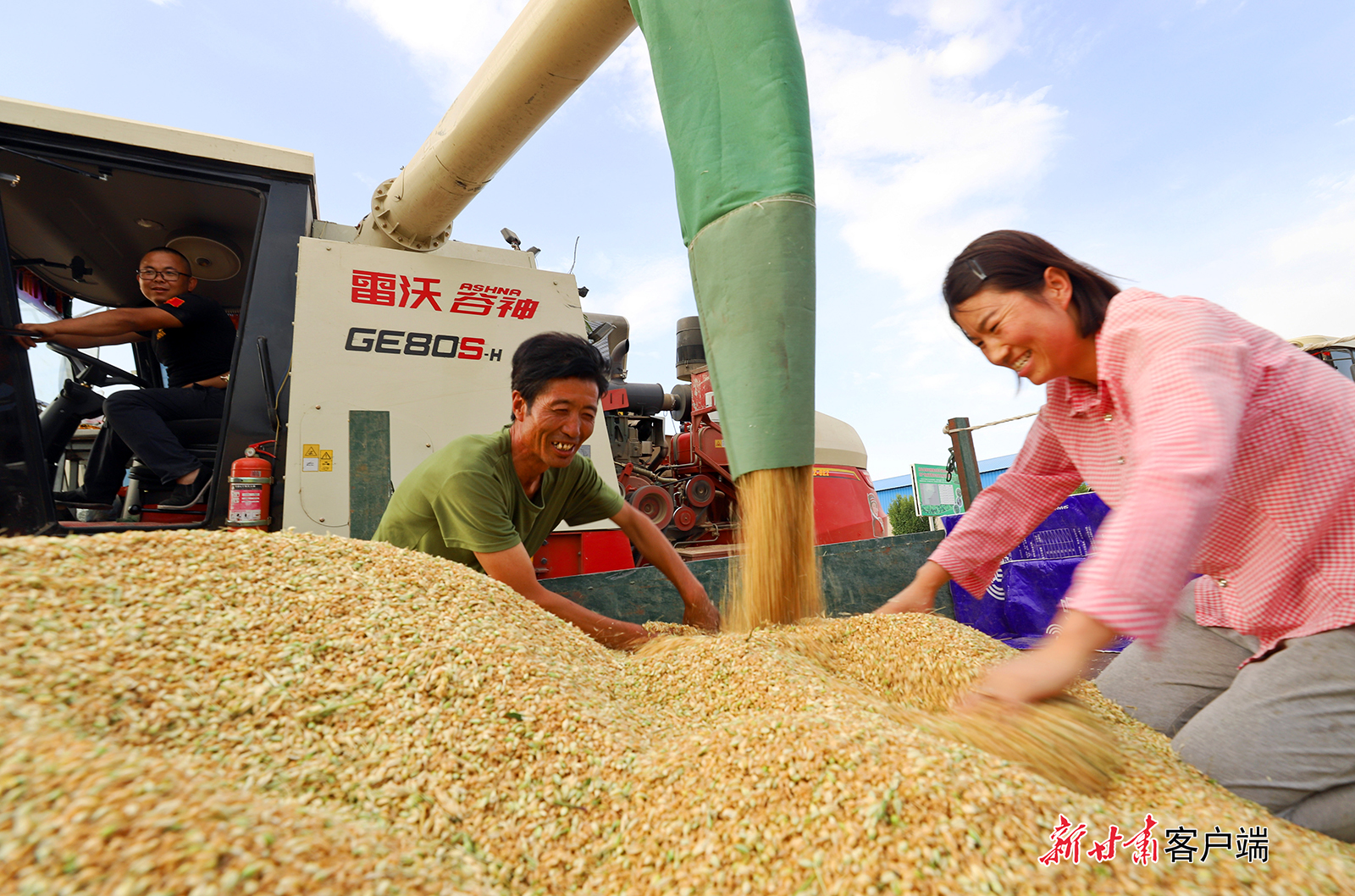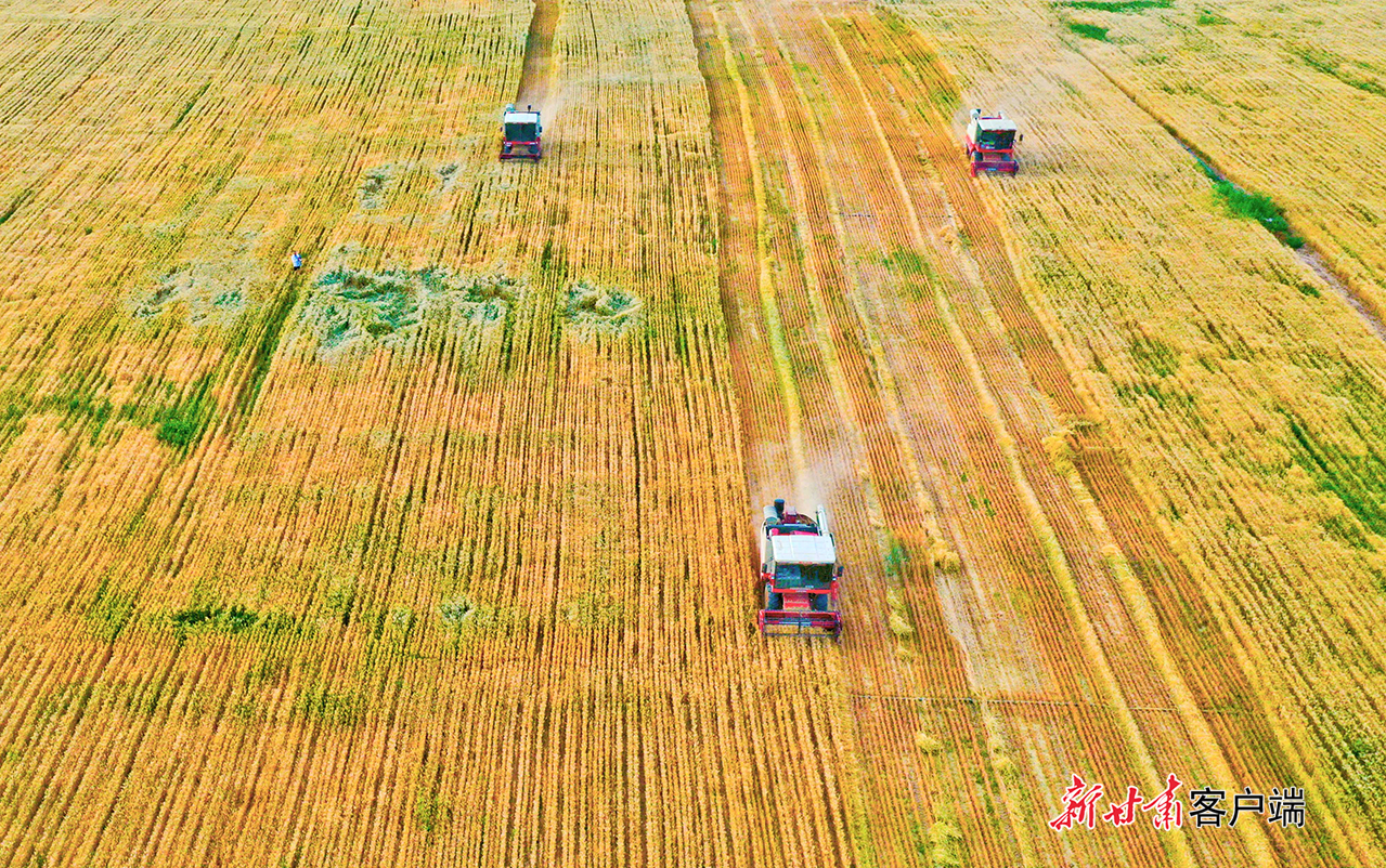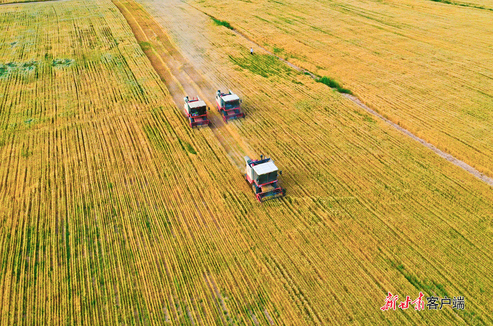 7月7日,张掖市高台县黑泉镇金河湾养殖产业园区内,新旺养殖农民专业合作社种植的300多亩小麦喜获丰收,一台台联合收割机穿梭往返,“吞”进沉甸甸的麦穗,“吐”出金灿灿的麦粒,拉开张掖65万多亩小麦夏收序幕。