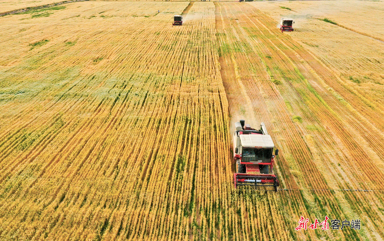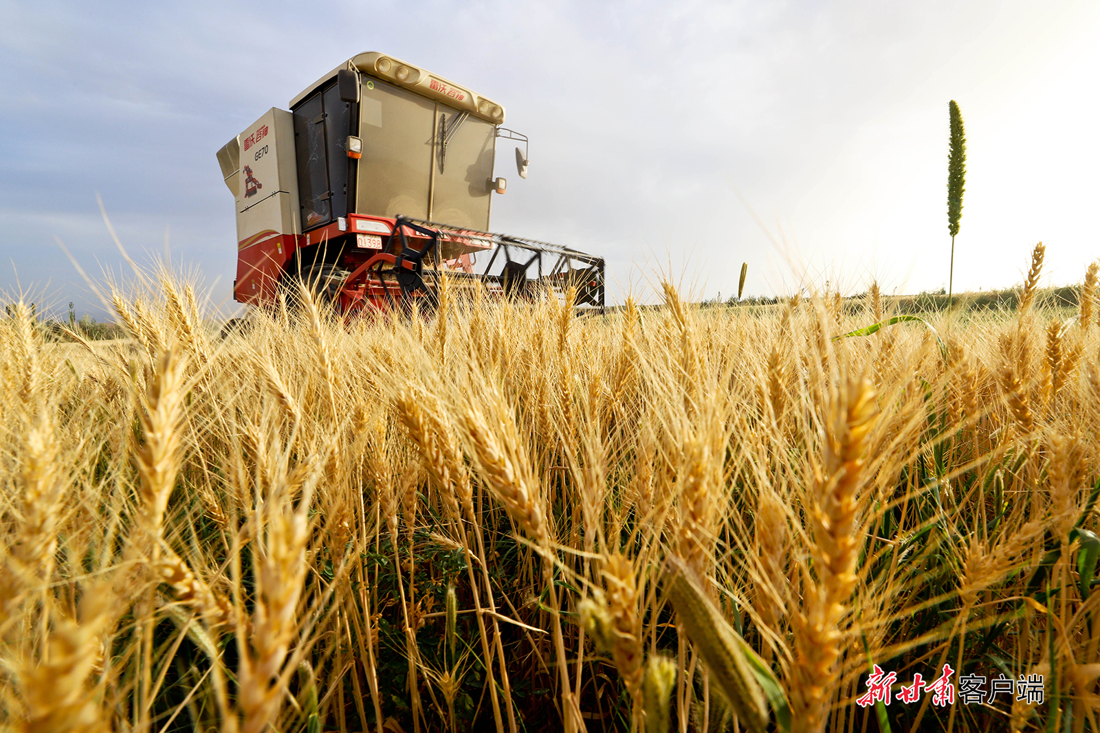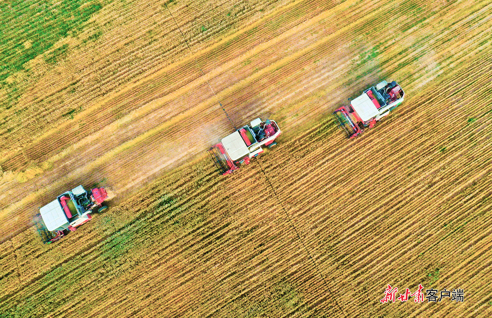 7月7日,张掖市高台县黑泉镇金河湾养殖产业园区内,新旺养殖农民专业合作社种植的300多亩小麦喜获丰收,一台台联合收割机穿梭往返,“吞”进沉甸甸的麦穗,“吐”出金灿灿的麦粒,拉开张掖65万多亩小麦夏收序幕。