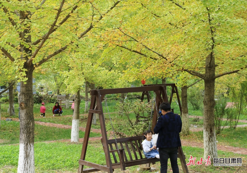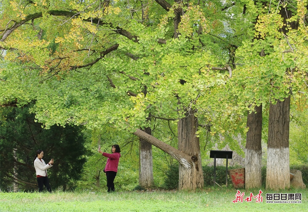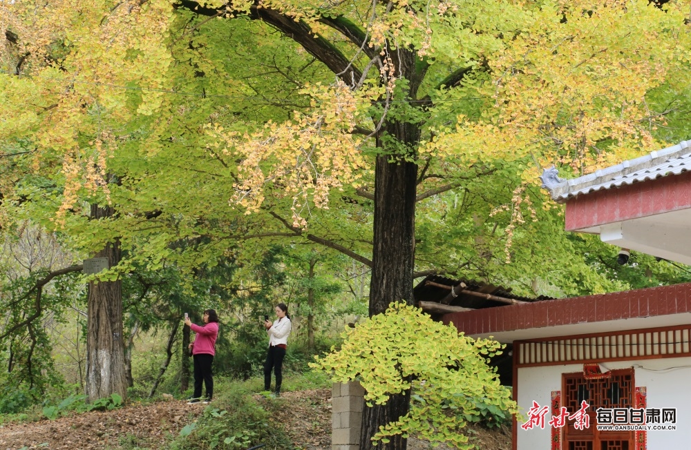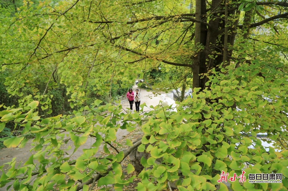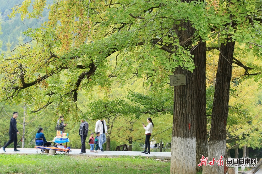 10月7日,游客慢步在陇南市徽县嘉陵镇田河村金灿灿的银杏树园、乐享金秋美好时光。据了解,今年国庆假日期间,“中国最美银杏村落”田河村千年以上的153棵、古银杏树叶璀璨金黄,吸引众多游客前来观赏游玩。