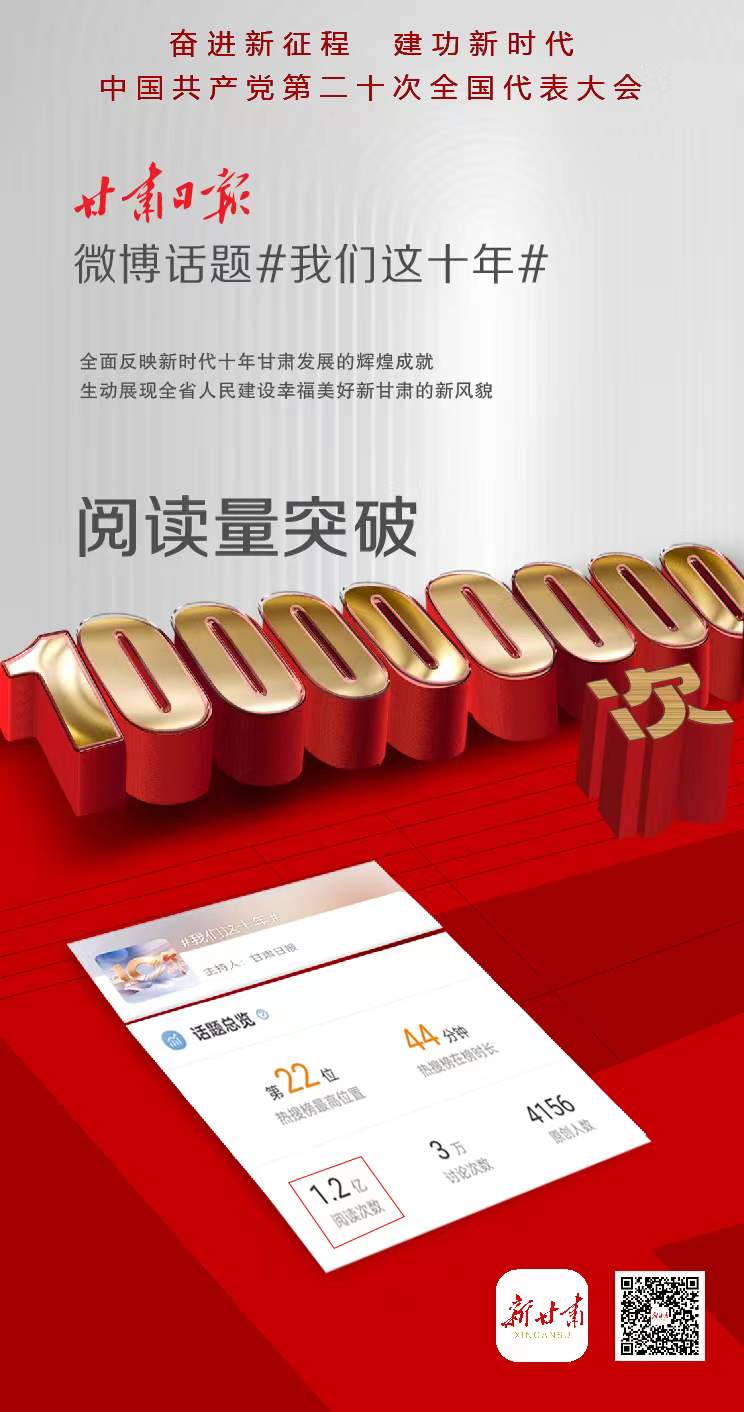 @甘肃日报新浪微博主持发起微博话题#我们这十年#引发网友热烈讨论,吸引了@中国青年报、@浙江日报、@江苏卫视、@陇东报等中央及省市媒体微博账号的积极参与,截至10月22日,阅读量突破1.2亿。甘肃新媒体集团围绕党的二十大共推出560多条原创视频;制作发布海报、长图、条漫、H5、SVG产品、融媒稿件等融媒体产品810多个,累计浏览量1.58亿人次。