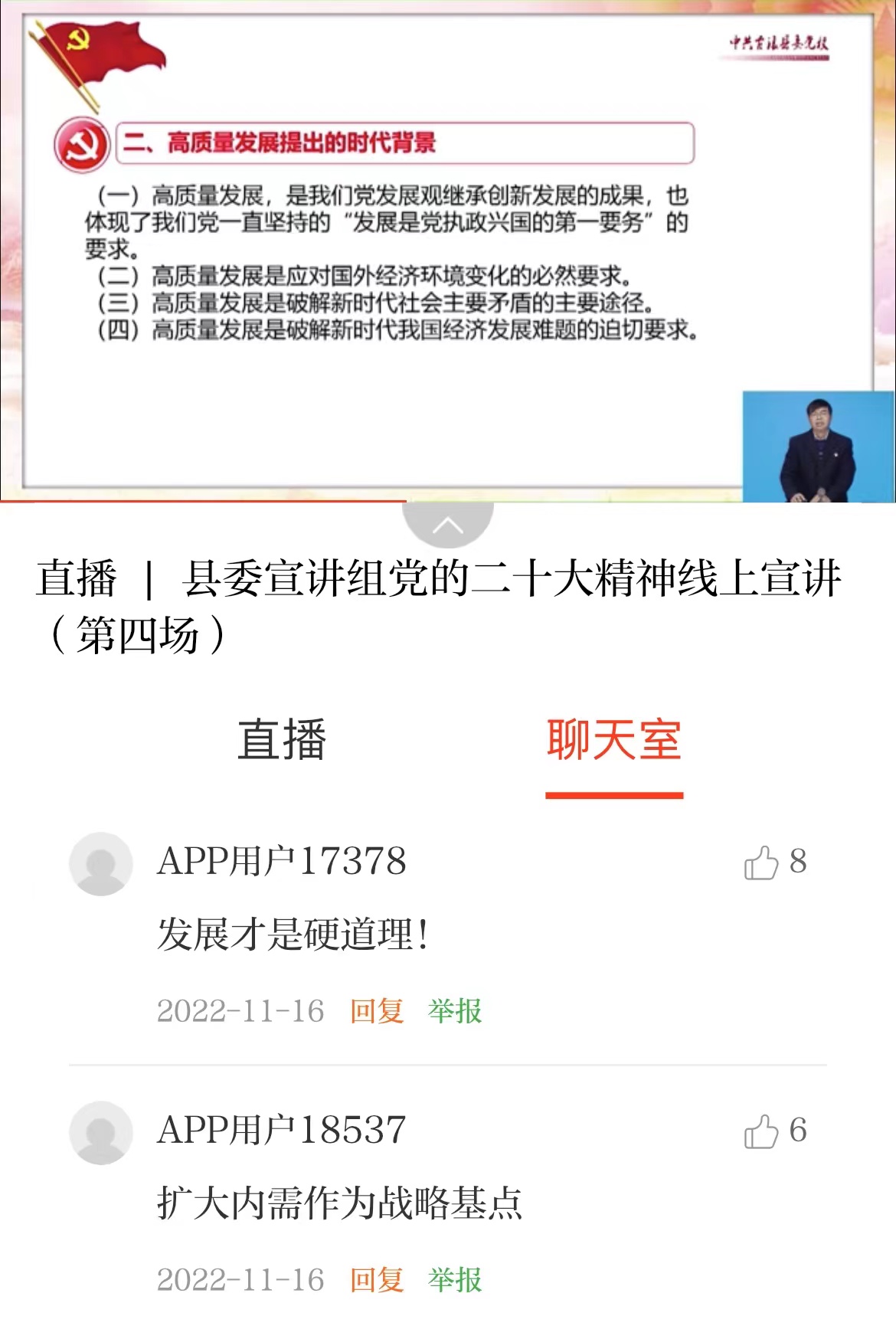 古浪县党员干部群众纷纷在直播间观看、点赞、留言,并表示线上直播的宣讲方式更便捷,随时随地打开手机就能看。据了解,11月13日至11月17日,“看古浪”APP连续五天进行党的二十大精神宣讲直播,持续提高党员干部的学习参与度,引导大家把思想和行动统一到党的二十大精神上来,把智慧和力量凝聚到落实党的二十大提出的各项任务上来。