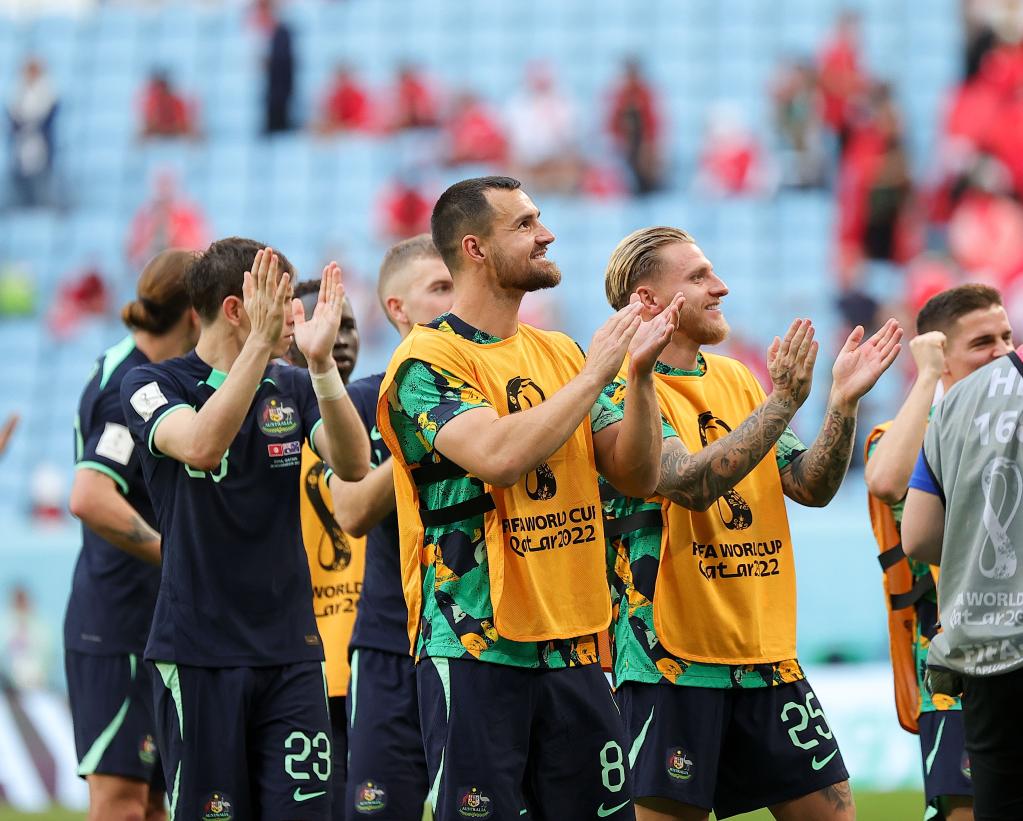 11月26日,澳大利亚队球员在战胜突尼斯赛后庆祝。新华社记者王东震摄