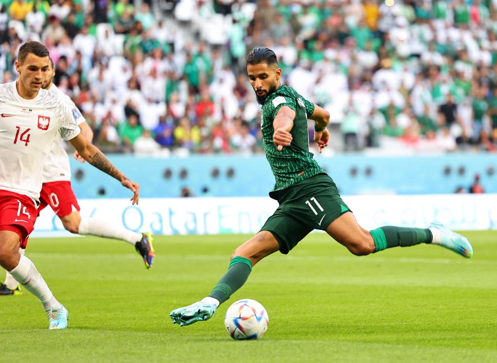 11月26日,沙特阿拉伯队球员萨利赫-谢赫里(右)在比赛中射门。新华社记者丁旭摄