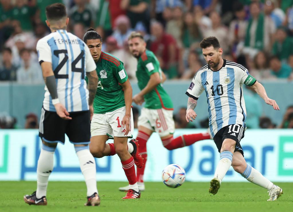 11月26日,阿根廷队以2比0战胜墨西哥队,图为阿根廷队球员梅西(右一)在比赛中传球。新华社记者潘昱龙摄