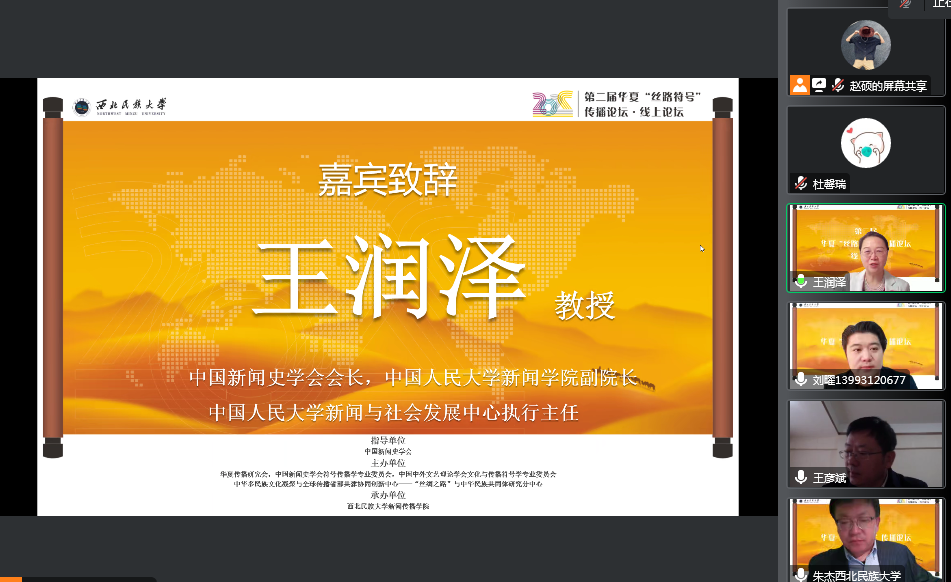 新甘肃客户端讯(新甘肃·每日甘肃网记者 李萍)12月3日,由中国新闻史学会指导,华夏传播研究会、中国新闻史学会符号传播学专业委员会、中国中外文艺理论学会文化与传播符号学分会、中华多民族文化凝聚与全球传播省部共建协同创新中心——“丝绸之路”与中华民族共同体研究分中心主办,西北民族大学新闻传播学院承办的第二届华夏“丝路符号”传播论坛在线上召开。