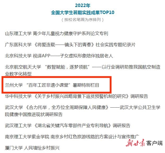 新甘肃客户端兰州讯(新甘肃·甘肃日报记者苏家英 吴涵)近日,2022年第八届全国大学生暑期实践展示活动获奖名单公布,来自兰州大学新闻与传播学院学生制作的“百年工匠非遗小课堂”暑期特别栏目入围2022年全国大学生暑期实践成果TOP10。