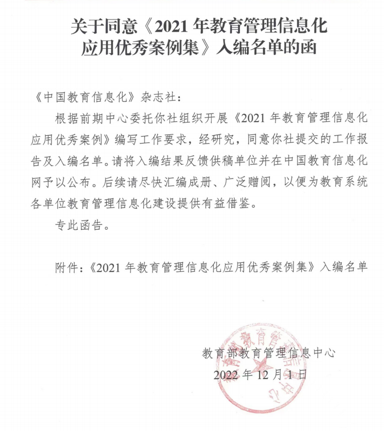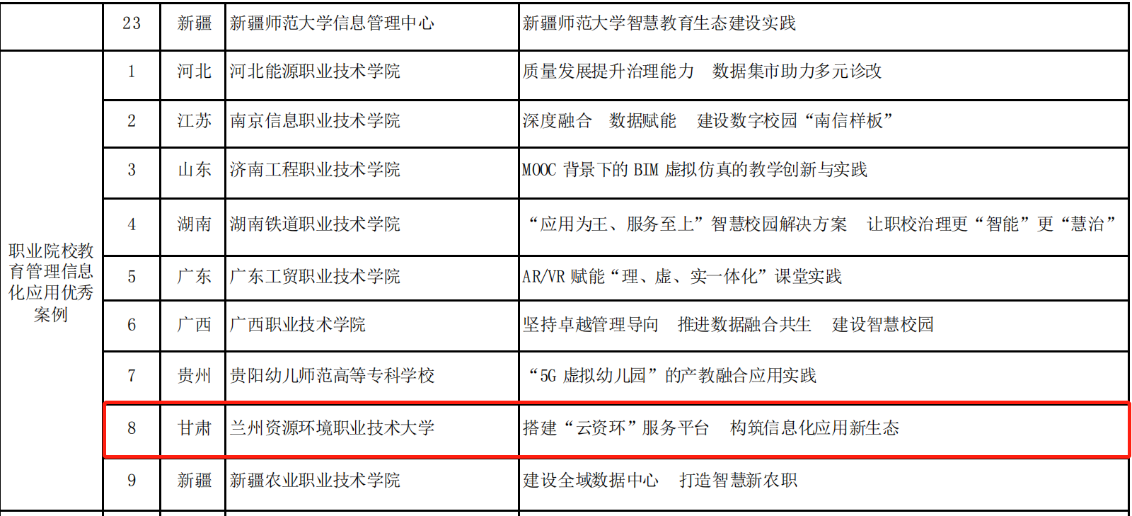 近日,教育部教育管理信息中心公布了《2021年教育管理信息化应用优秀案例集》入编名单,全国共有9所高职院校入选“职业院校教育管理信息化应用优秀案例”。兰州资源环境职业技术大学申报的案例“搭建‘云资环’服务平台 构筑信息化应用新生态”成功入选,为甘肃省职业院校唯一入选案例。