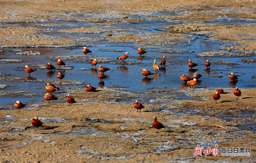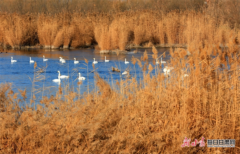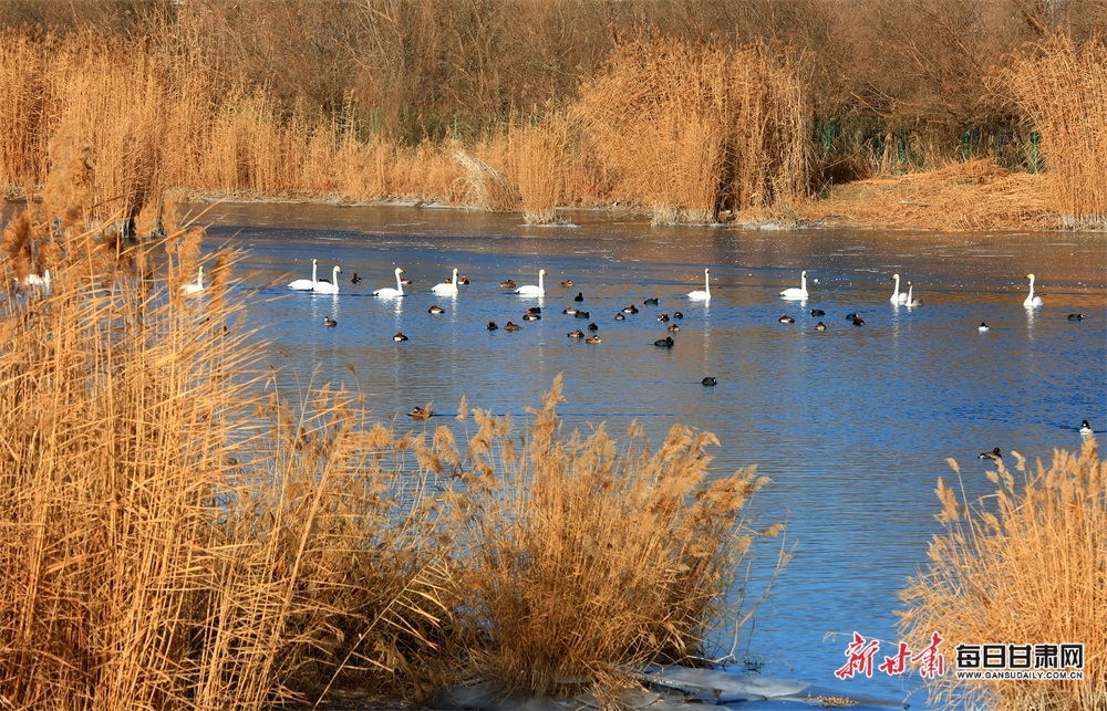 12月12日,张掖黑河湿地国家级自然保护区,一群群大天鹅、赤麻鸭、红嘴潜鸭、灰椋鸟在苇溪、河滩上栖息、觅食、飞舞。