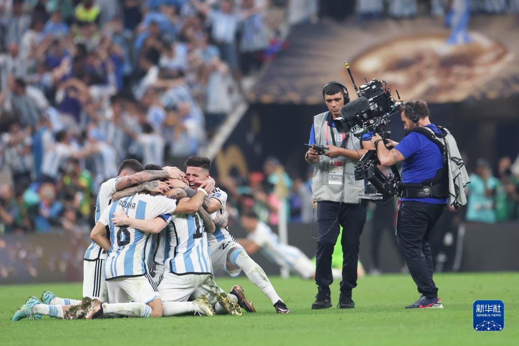 12月18日,阿根廷队球员在比赛后庆祝胜利。新华社记者 曹灿 摄