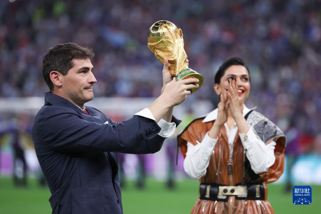 12月18日,前西班牙队守门员卡西利亚斯(左)在比赛前展示大力神杯。新华社记者 曹灿 摄