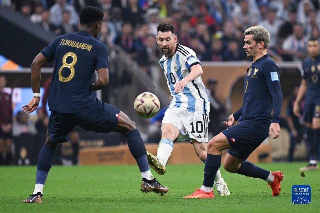 12月18日,阿根廷队球员梅西(左一)在比赛中与法国队球员于帕梅卡诺拼抢。新华社记者 潘昱龙 摄