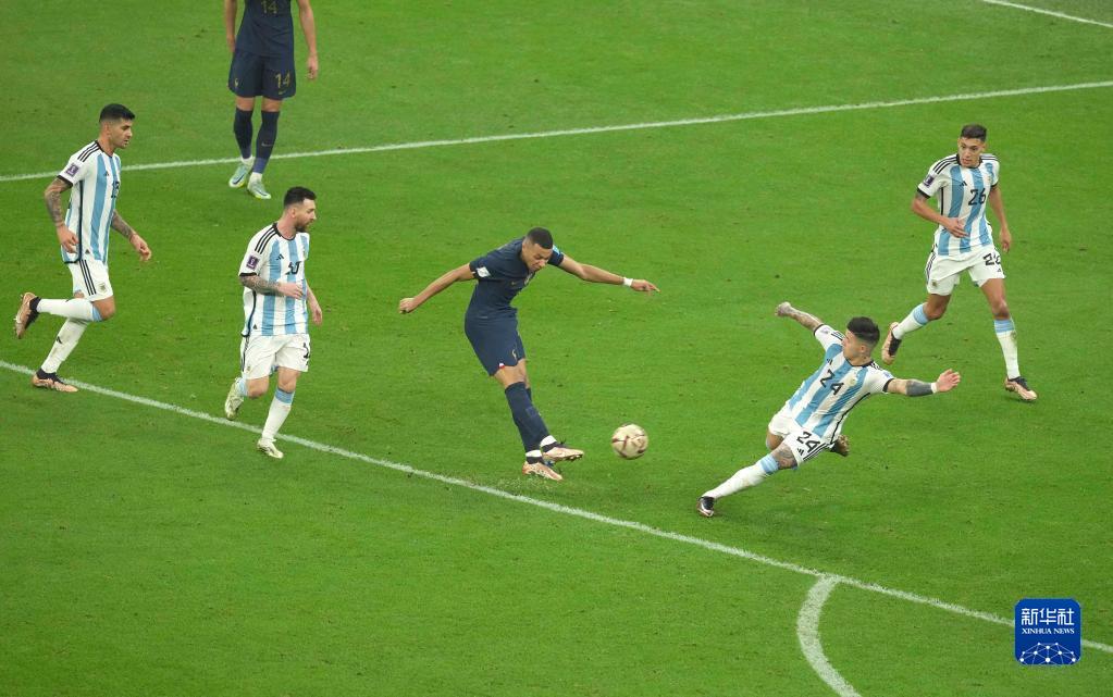 12月18日,法国队球员姆巴佩在比赛中射门得分。新华社记者 李明 摄