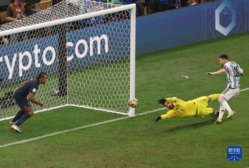 12月18日,阿根廷队球员梅西(右)在加时赛中射门得分。新华社记者 徐子鉴 摄