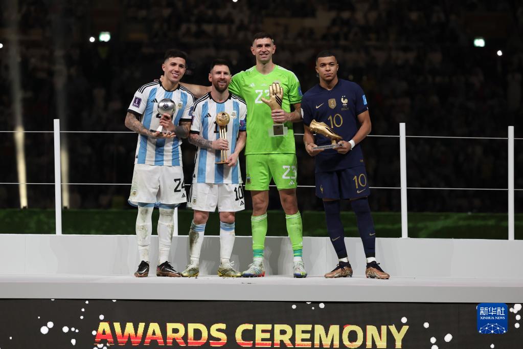 12月18日,在本届世界杯上获得最佳新秀奖的阿根廷队球员恩佐·费尔南德斯(左一)、获得金球奖的阿根廷队球员梅西(左二)、获得金手套奖的阿根廷队守门员马丁内斯(右二)与获得金靴奖的法国队球员姆巴佩在颁奖仪式上合影。新华社记者 曹灿 摄