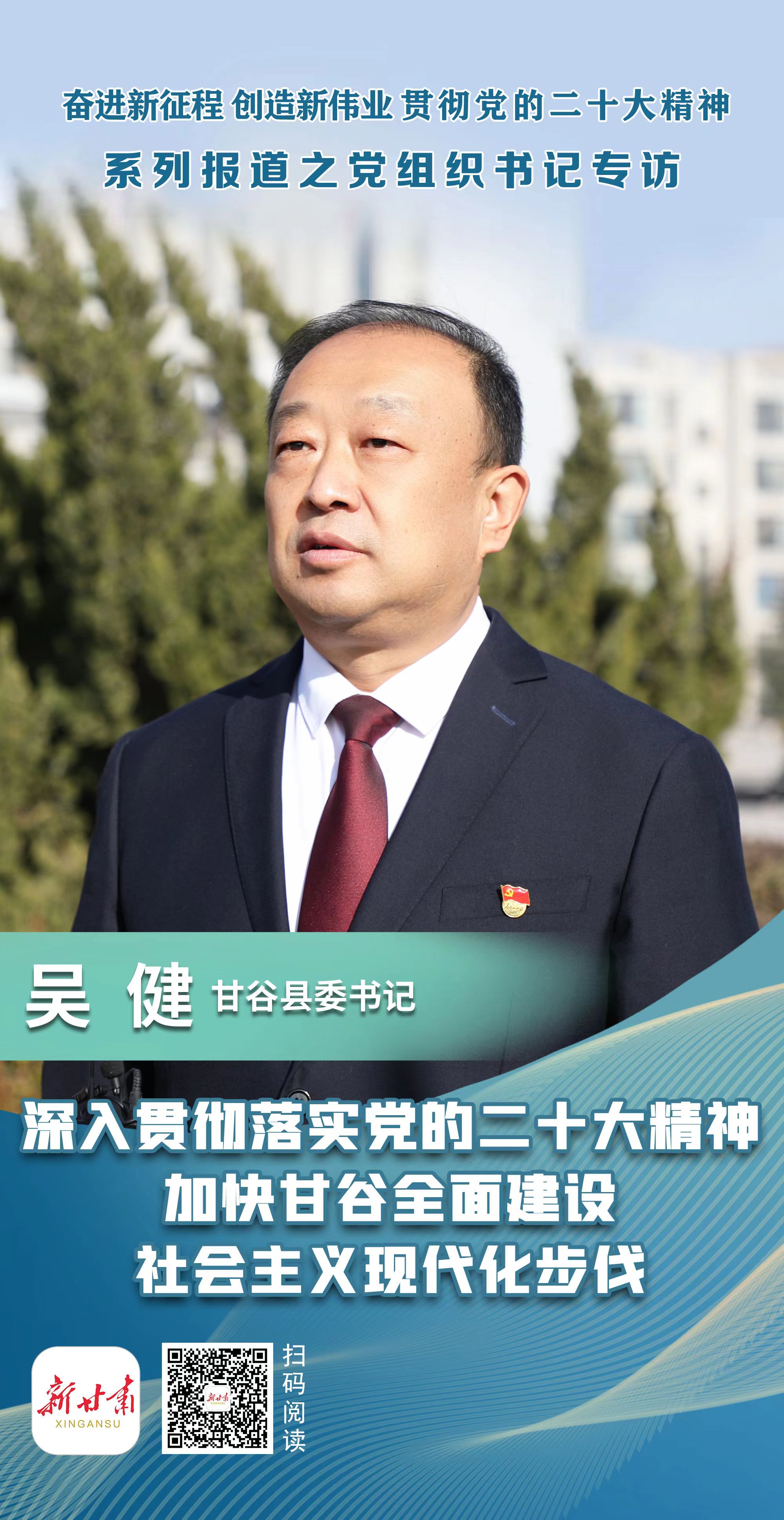 “党的二十大描绘了全面建设社会主义现代化国家、全面推进中华民族伟大复兴的宏伟蓝图,为新时代新征程党和国家事业发展、实现第二个百年奋斗目标指明了前进方向、确立了行动指南,为我们奋进新征程、建功新时代提供了指引和遵循。”近日,甘谷县委书记吴健在接受甘肃日报记者专访时说,甘谷县将把贯彻落实党的二十大精神作为当前和今后一个时期的首要政治任务,凝心聚力推动各项目标任务落地见效。