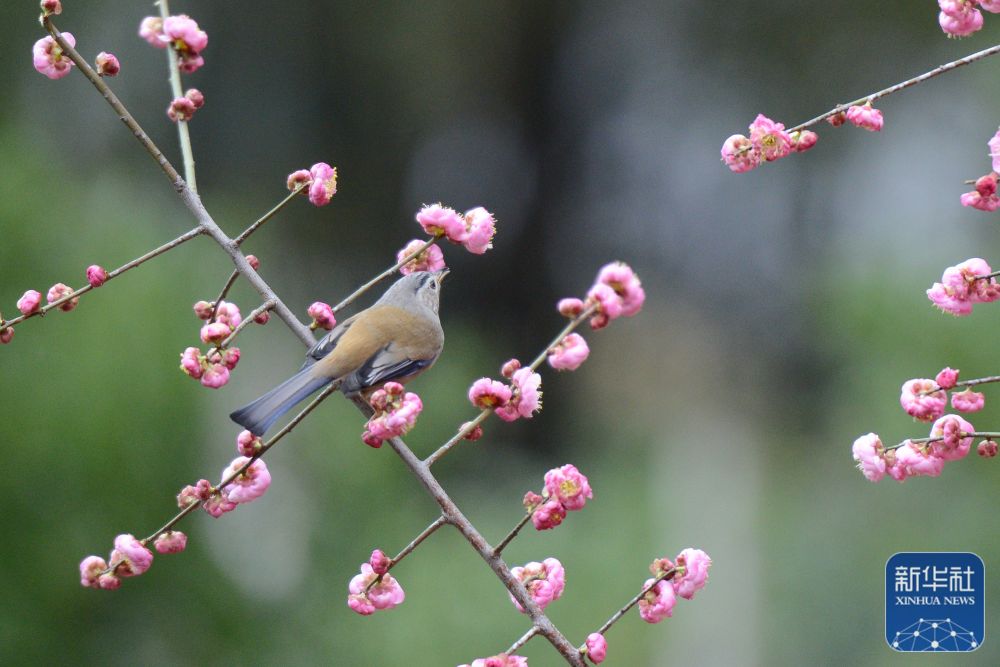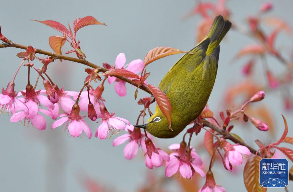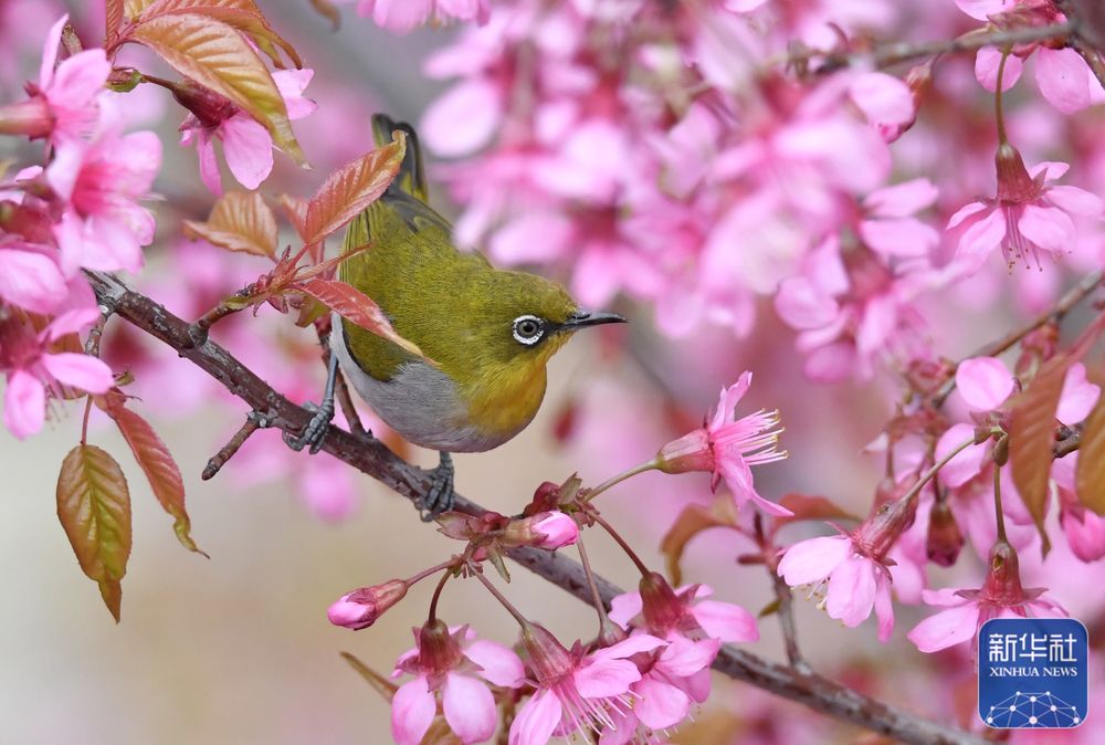 ↑2月15日,绣眼鸟在贵州省贵阳市南明河畔水东路段的冬樱花树上穿梭于花枝间觅食啄花。新华社发(秦刚摄)