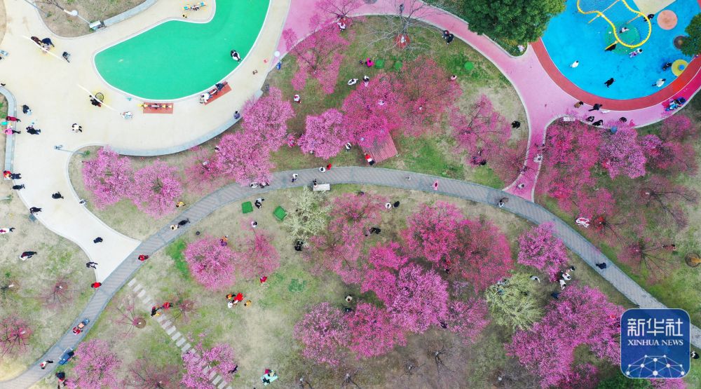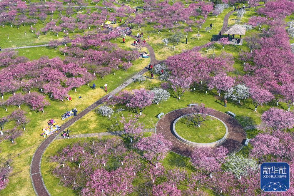 ↑2月15日,安徽省合肥市蜀山区绿轴公园梅花盛开,众多市民前来游玩赏花(无人机照片)。新华社发(陈三虎摄)