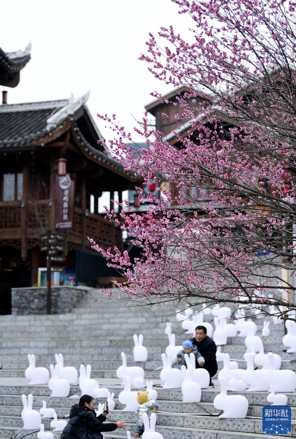 ↑2月15日,在湖北省宣恩县城兴隆老街,人们在梅花掩映下的吊脚楼前游玩。新华社发(宋文摄)