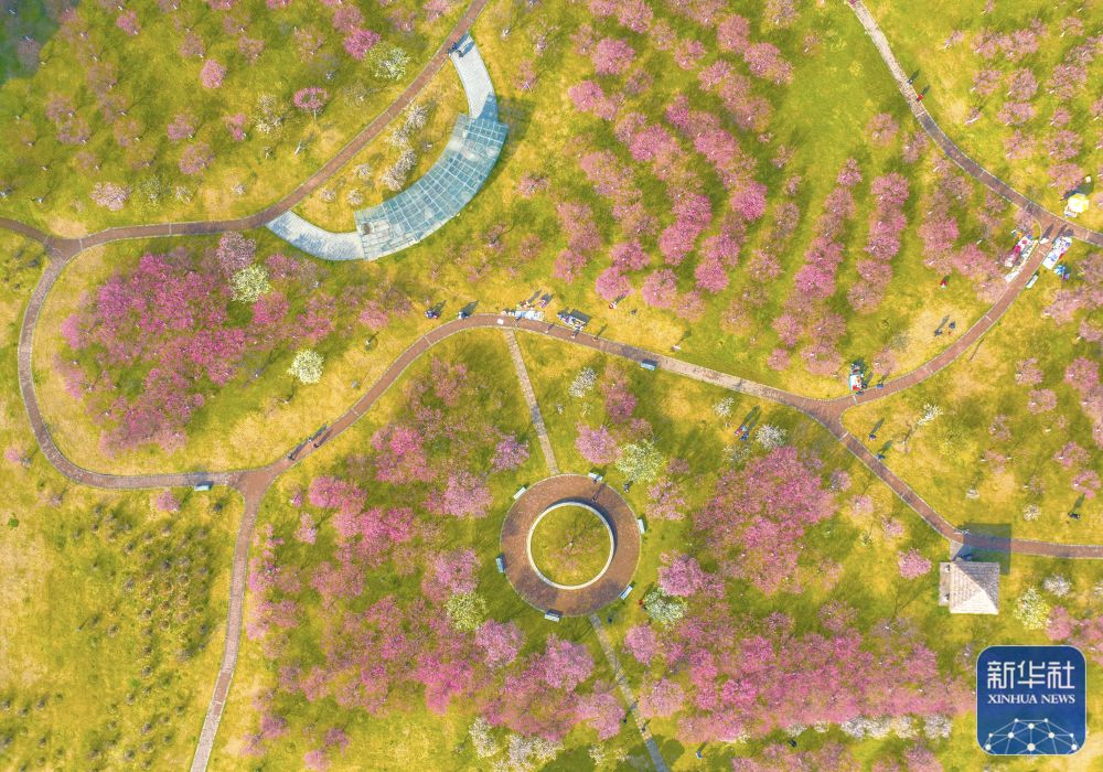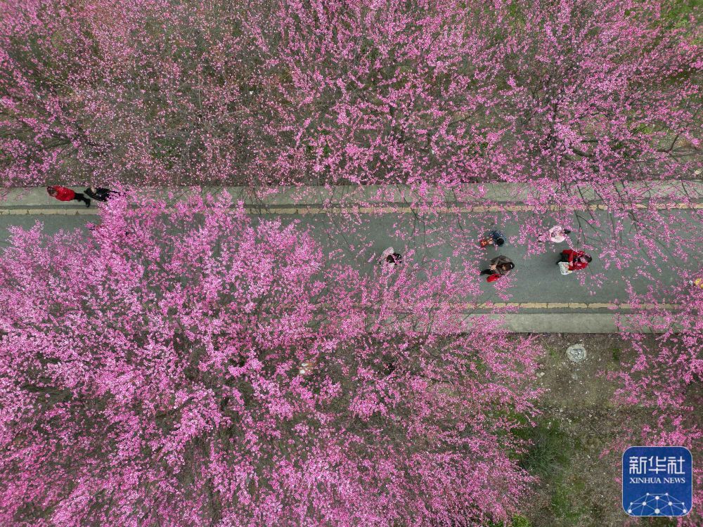 ↑2月15日,在贵州省遵义市余庆县都市第三地生态园,游客在梅花园游玩(无人机照片)。新华社发(贺春雨摄)