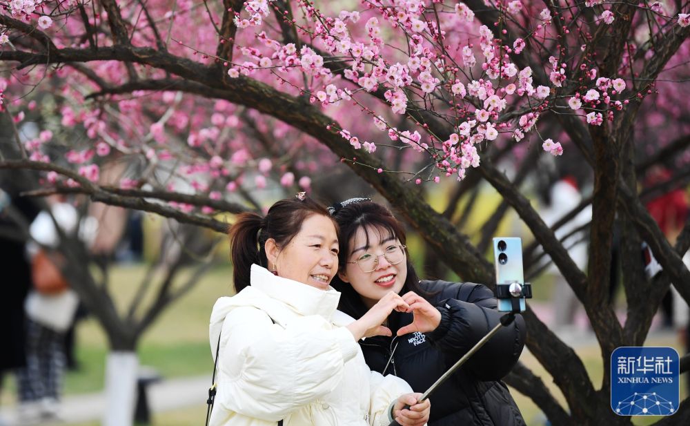 ↑2月15日,安徽省合肥市蜀山区绿轴公园梅花盛开,市民前来拍照打卡留念,尽享春光。新华社发(陈三虎摄)