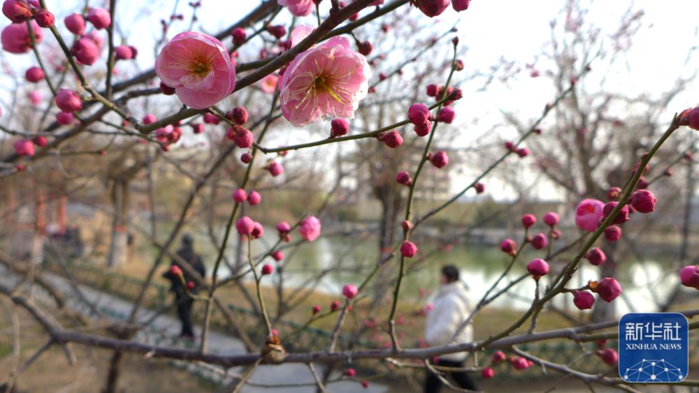 2月16日,游人在河南省开封市御河河畔漫步赏花。新华社发(李俊生 摄)
