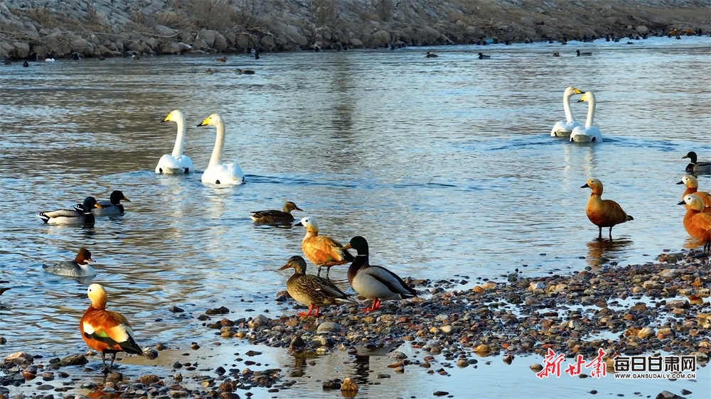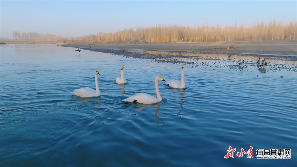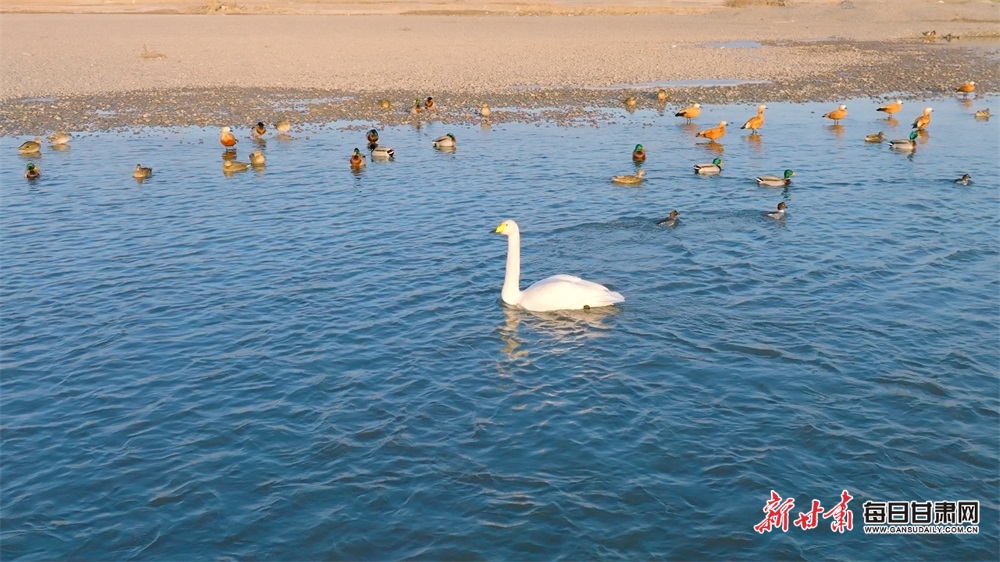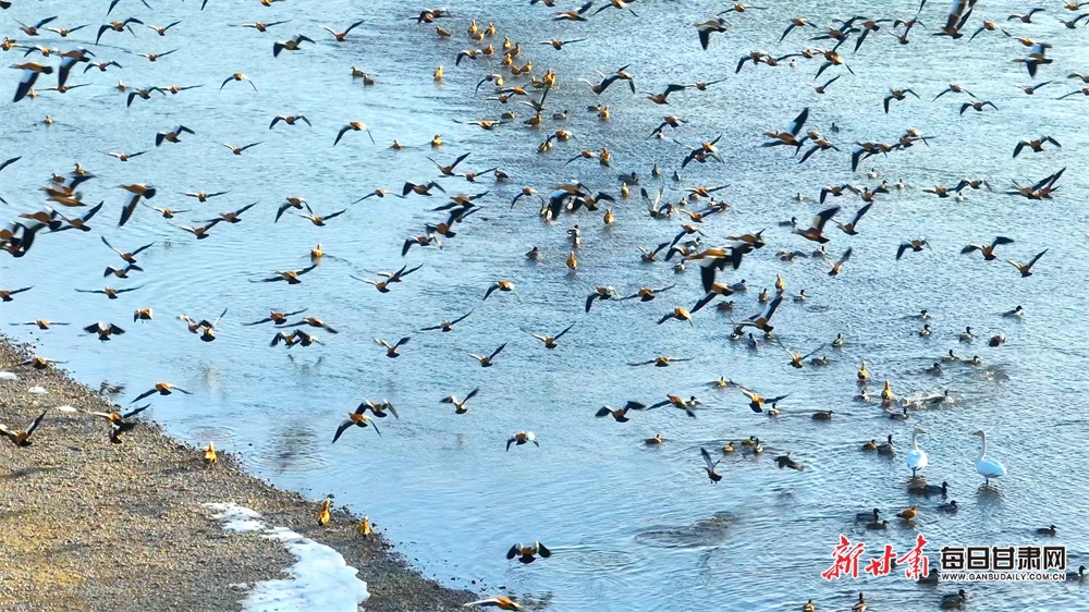 早春二月,临泽黑河湿地迎来白天鹅、赤麻鸭等候鸟休憩觅食、补充体力。