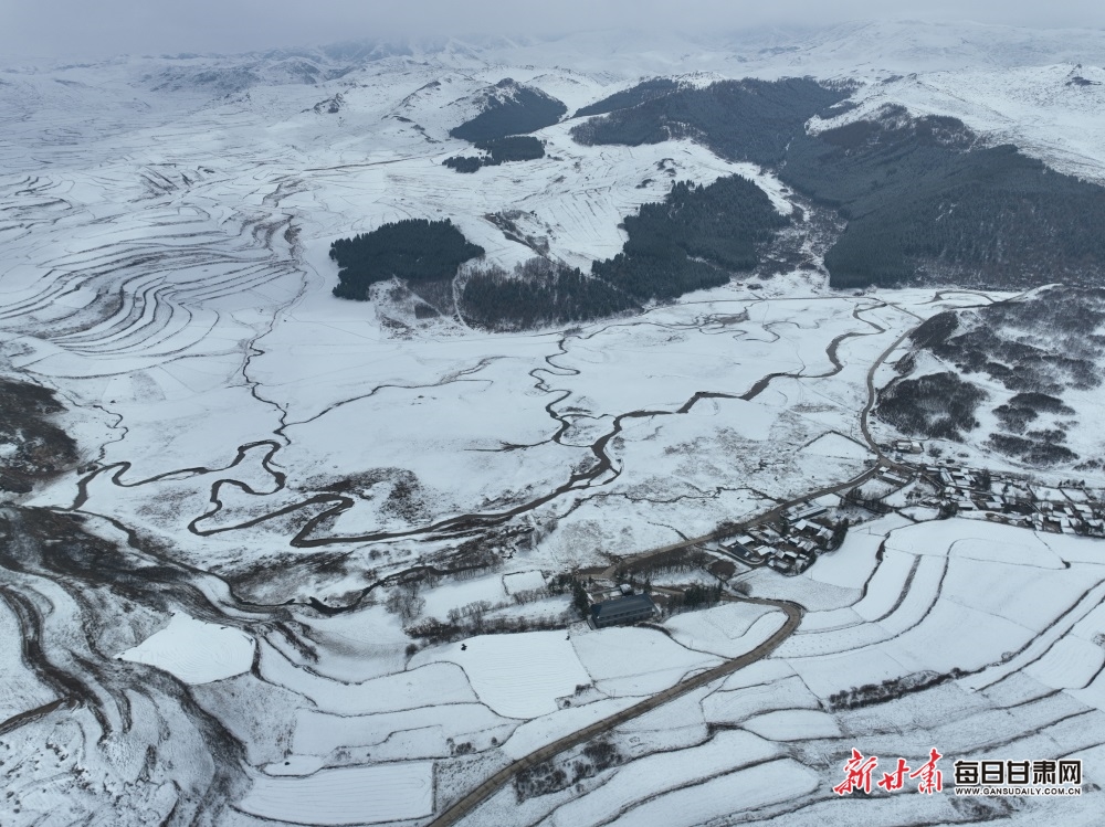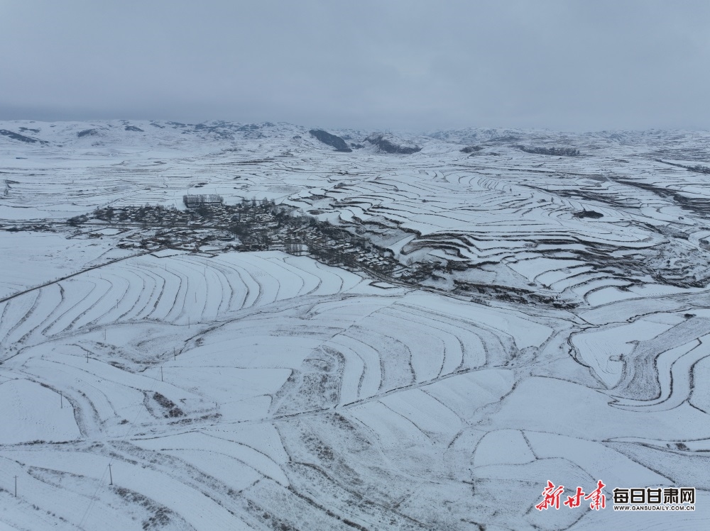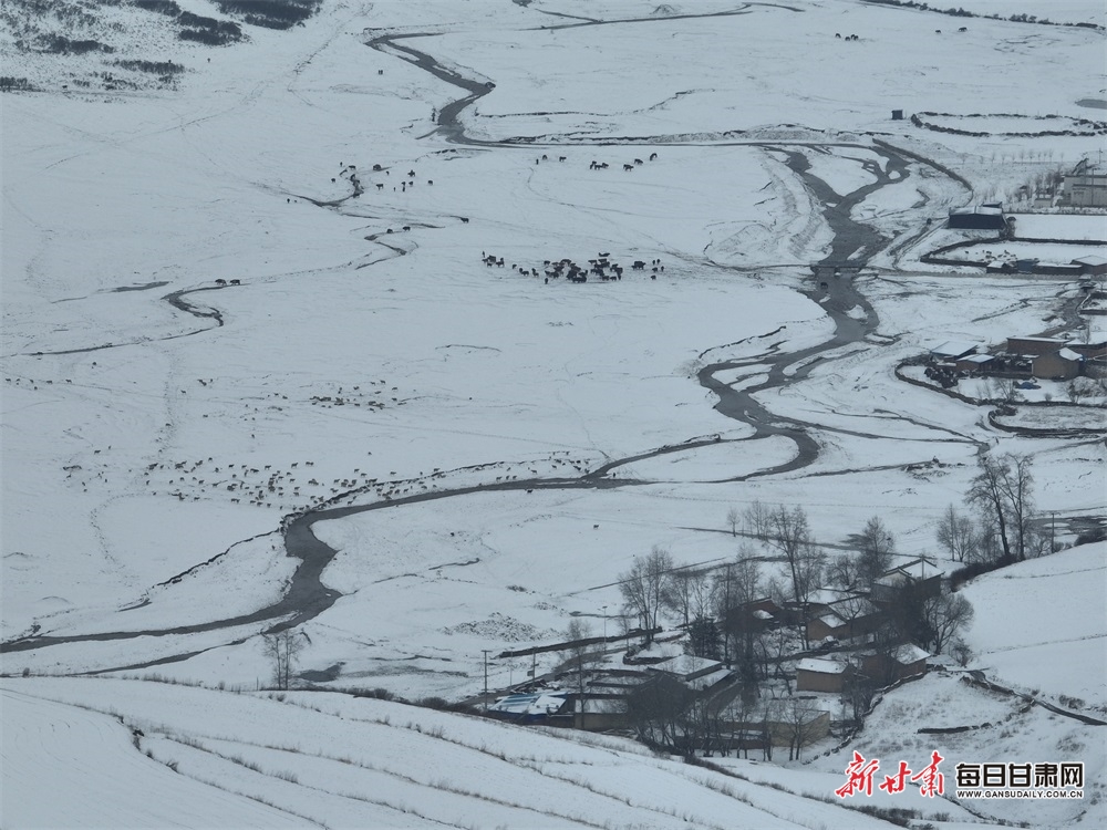 块块梯田被皑皑白雪覆盖,牛群在草原上吃草,远处逶迤的山峦与草原风光尽收眼底,构成一幅自然天成的水墨画卷。