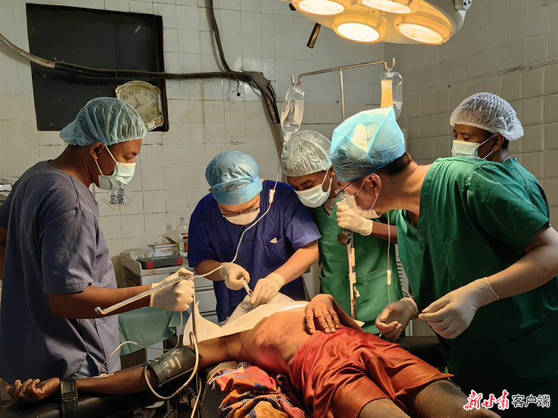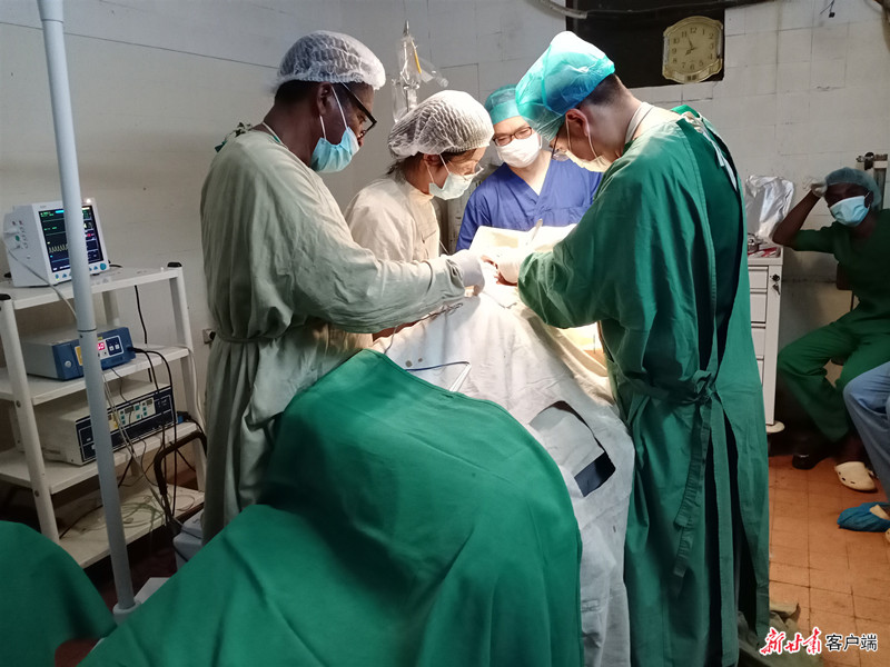 中国援马医疗队队员们立即采取快速输液、紧急输血等措施,维持患者血容量及生命体征。经快速准备后,大家决定由贺逢孝主刀,队友杜武、张凤荣协助,蒋治中担任麻醉师对患者进行手术抢救。但由于麻醉机太过陈旧,无法进行全麻,蒋治中迅速进行颈内静脉穿刺置管,畅通静脉通道,经过简单扩容抗休克后实施高位连续硬膜外麻醉,保障手术顺利进行。