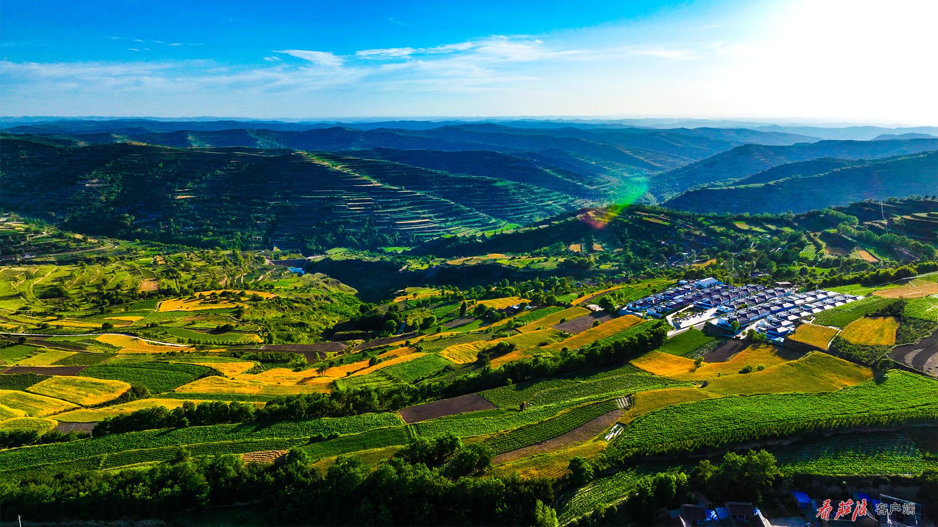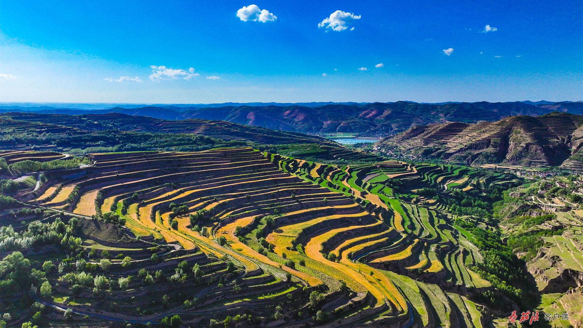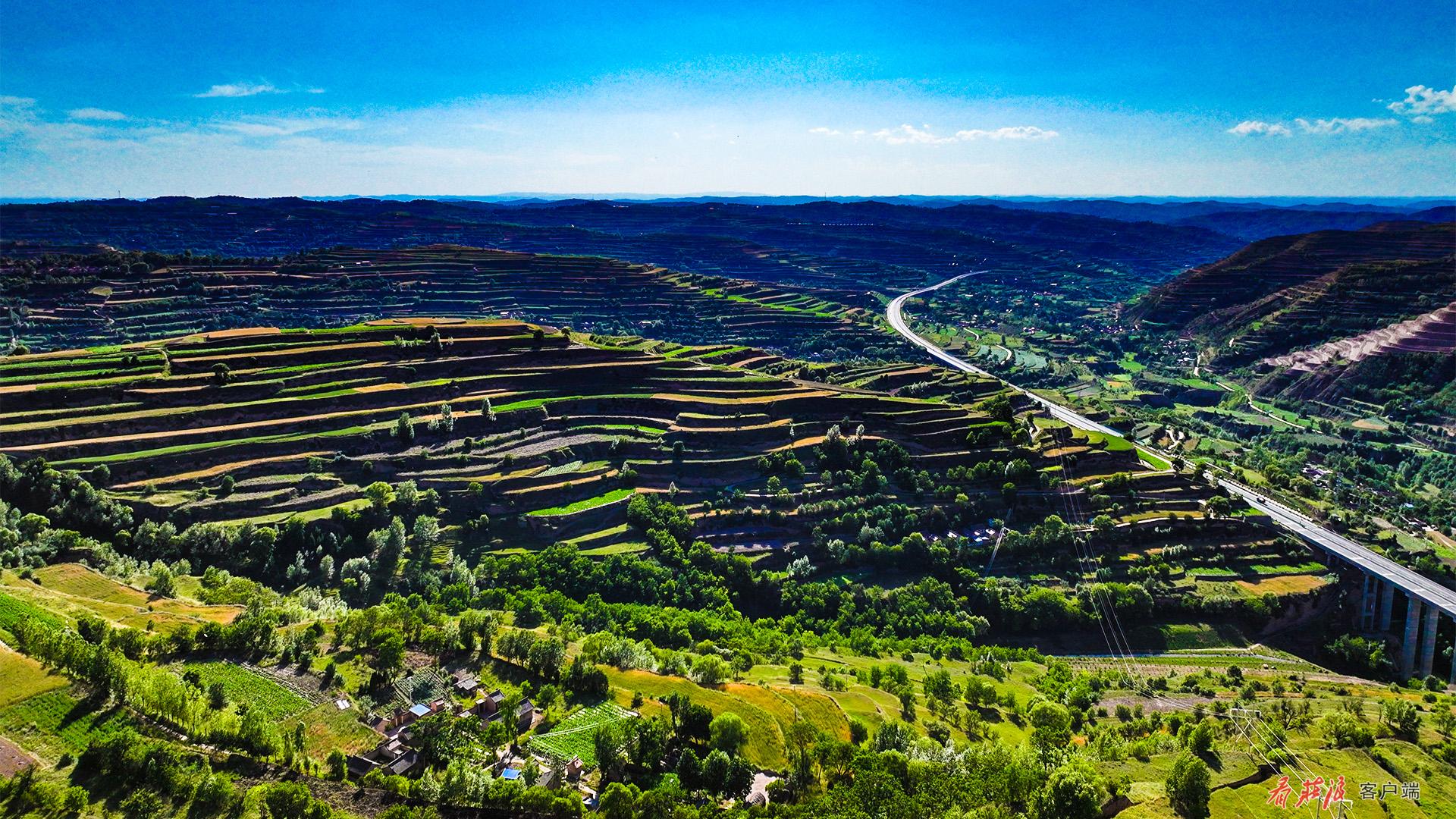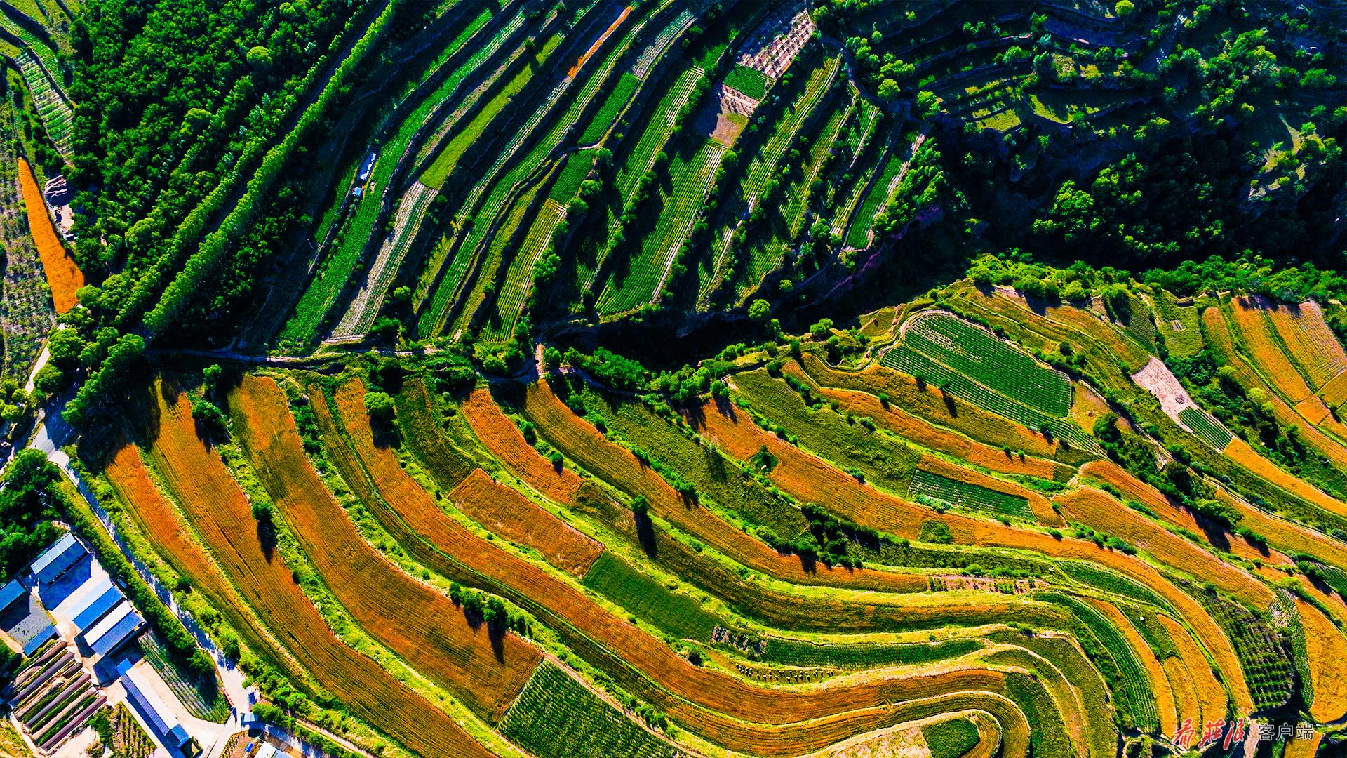 高空俯瞰,百万亩梯田,如同千万条绿色的彩带,环绕在山川之间。金黄色的麦田,翠绿的果园,一幕幕美丽的图景令人目不暇接。