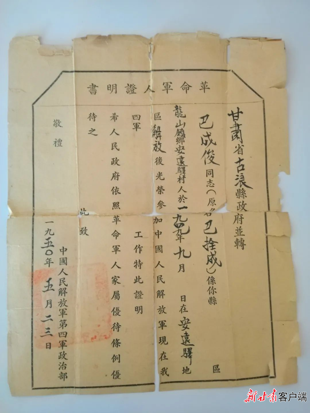1949年,出生于武威市天祝县安远镇柳树沟村的巴成俊刚刚17岁。这一年,巴成俊应征入伍,从一名气象站勤务工作人员变成第一野战军四军十师第八团中的一员。
