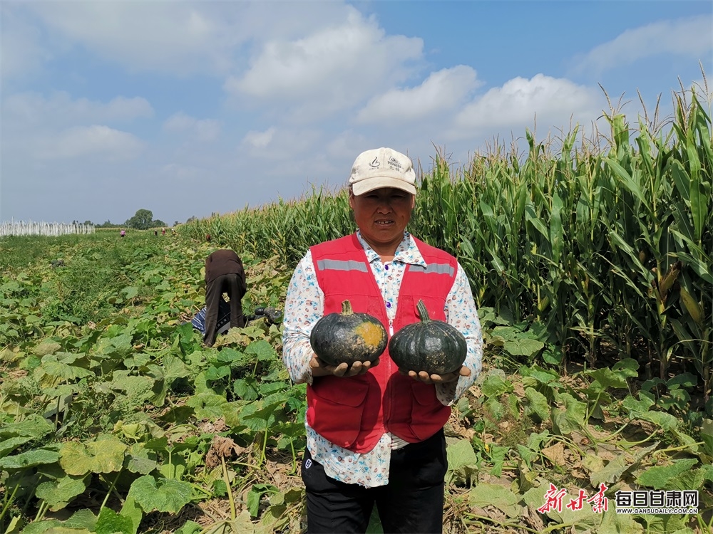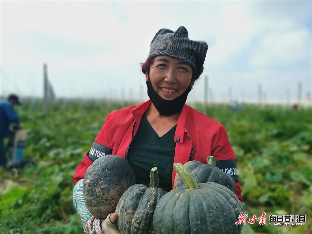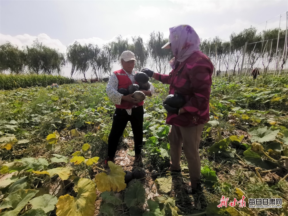 9月14日,崆峒区草峰镇丁寨村南瓜种植基地,农户们正在采摘南瓜。