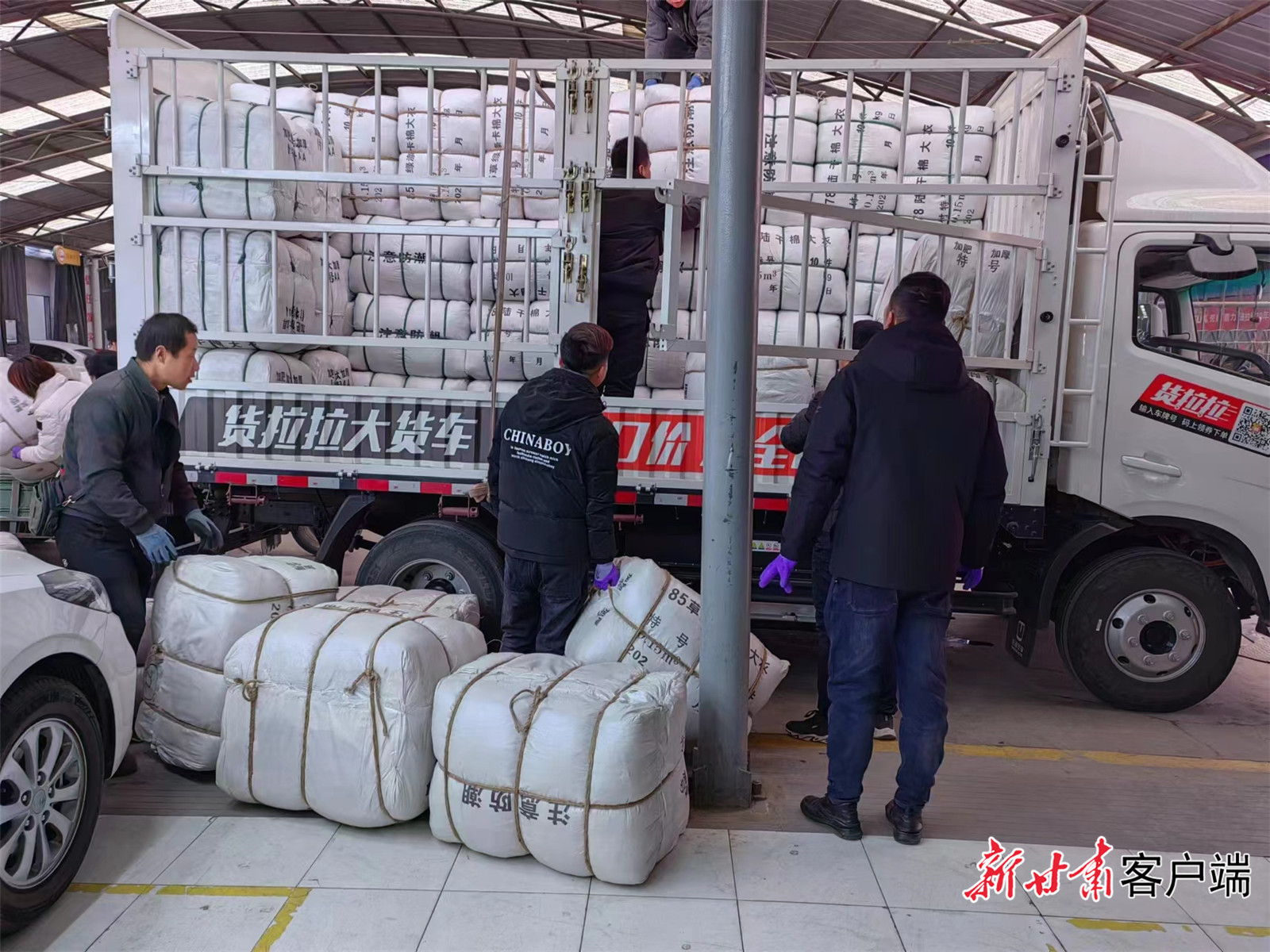 甘肃妇女儿童发展基金会筹集的棉衣、棉被、电暖气等救灾物资正在装车。(省妇联供图)