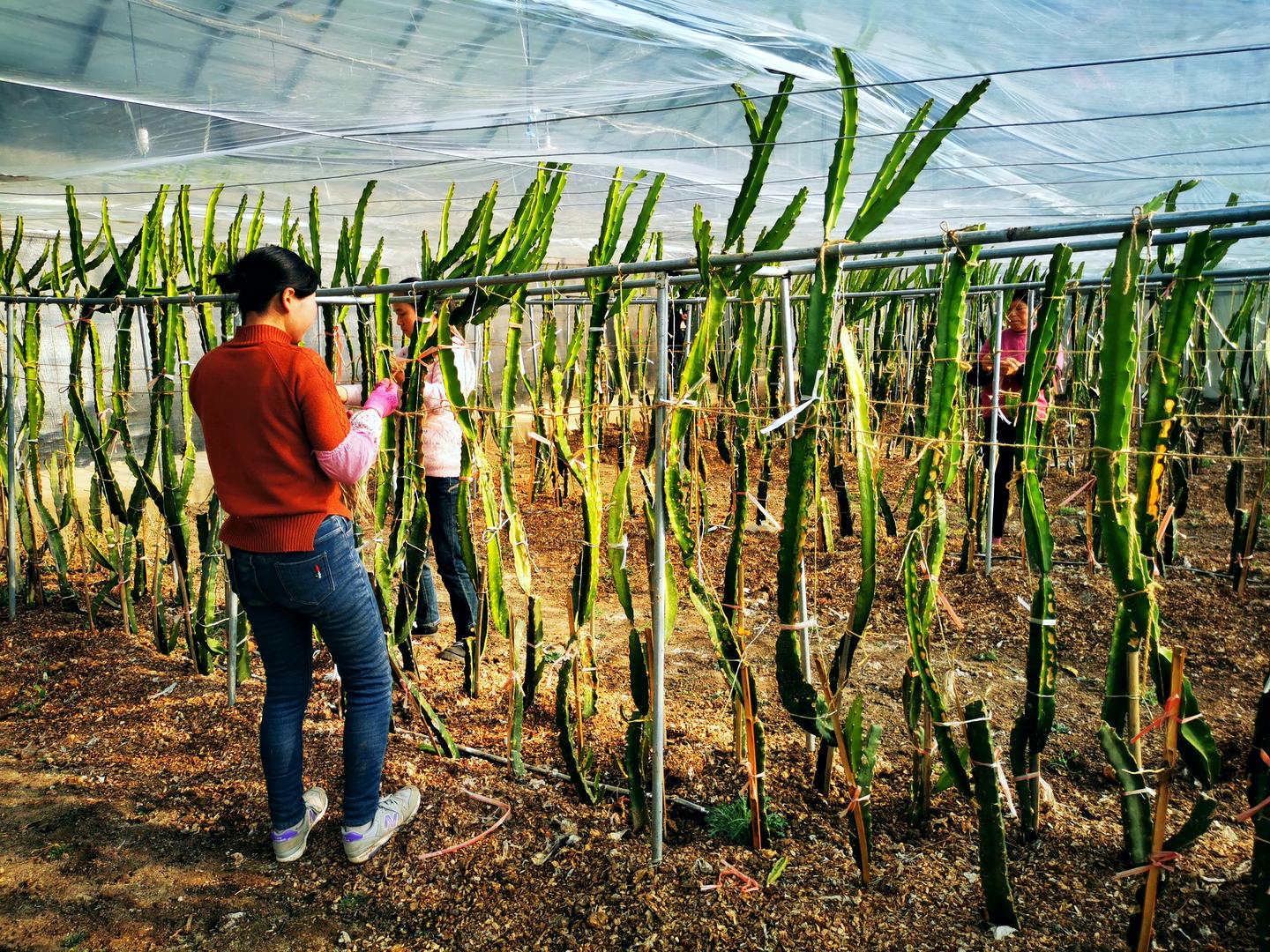 多元化发展,畅通了销售渠道,促进了菜农增收。走进富康循环农牧投资责任有限公司火龙果种植大棚,火龙果树苗长势喜人,工人们正忙着给火龙果绑枝,搭架子,为来年6月份挂果做前期准备。