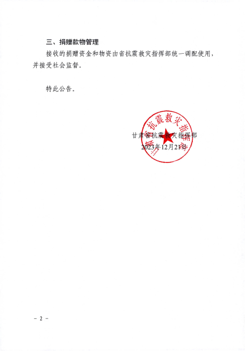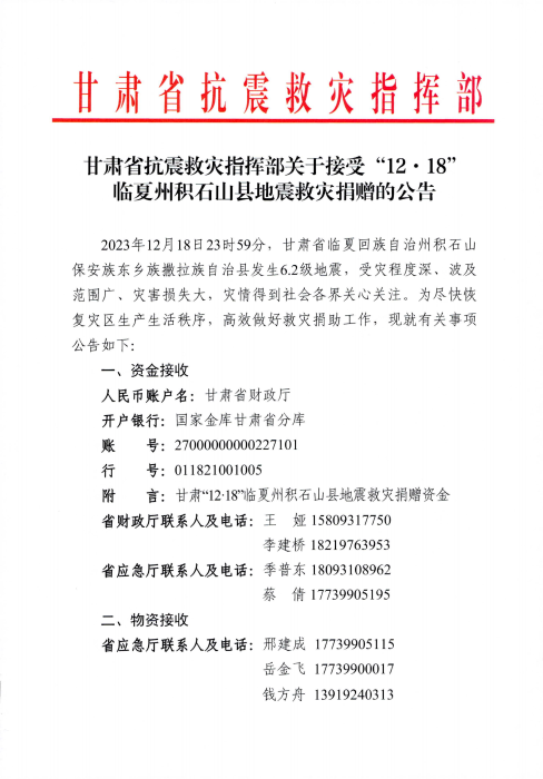 新甘肃客户端兰州讯(新甘肃·甘肃日报记者 顾丽娟)积石山6.2级地震受灾程度深、波及范围广、灾害损失大,灾情得到社会各界关心关注。为尽快恢复灾区生产生活秩序,高效做好救灾捐助工作,12月21日,甘肃省抗震救灾指挥部发布关于接受积石山6.2级地震救灾捐赠的公告。