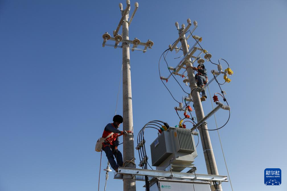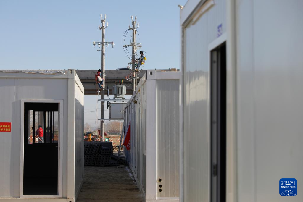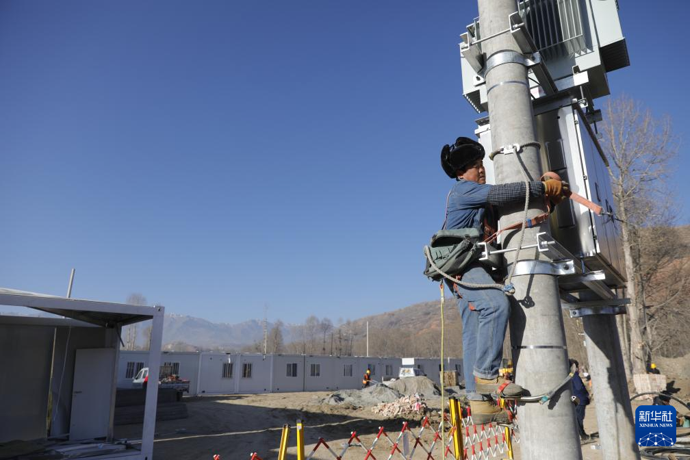 12月27日,在积石山县吹麻滩镇集中安置点,国家电网工作人员在对安置点进行通电作业。新华社记者 方欣 摄