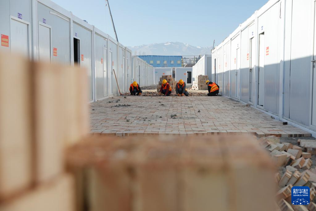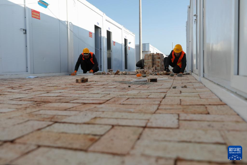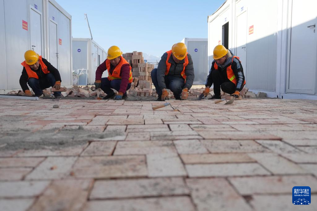 12月27日,在积石山县吹麻滩镇集中安置点,甘肃省公航旅集团施工人员在对安置点进行地面硬化。新华社记者 陈斌 摄