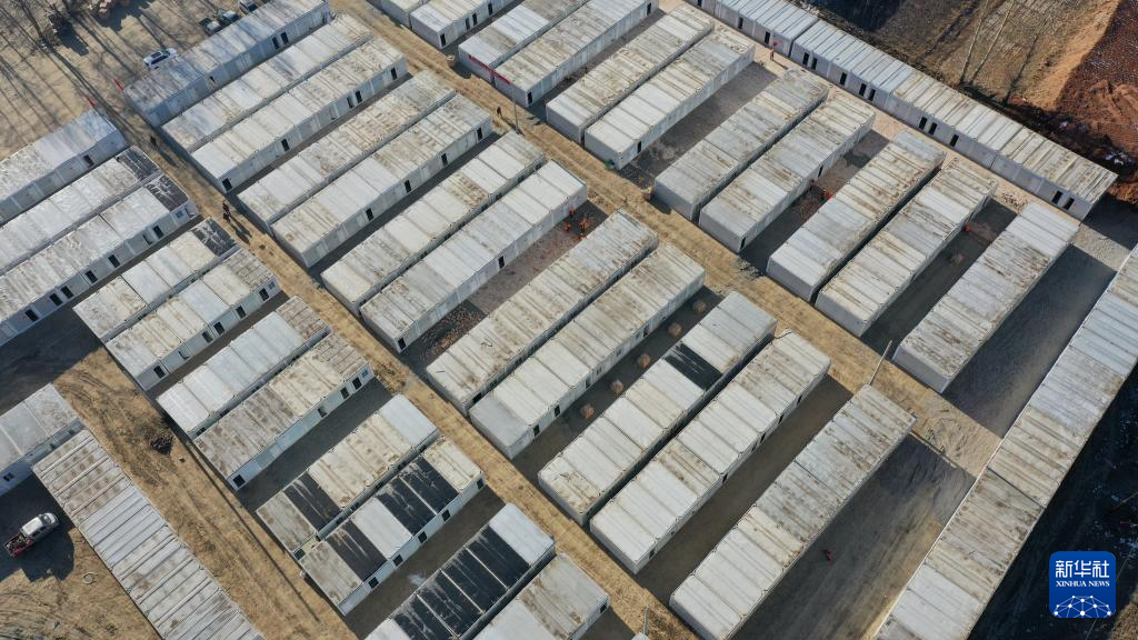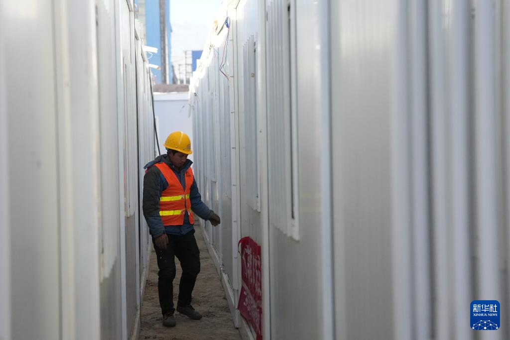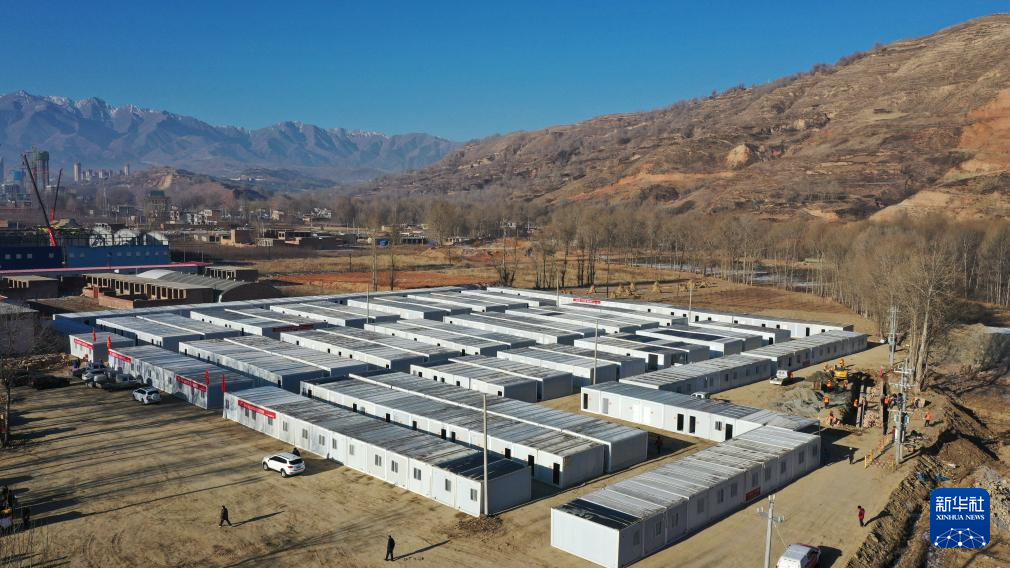 12月27日,在积石山县吹麻滩镇集中安置点,甘肃省公航旅集团施工人员在检查板房情况。新华社记者 陈斌 摄