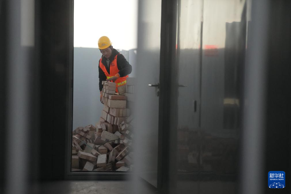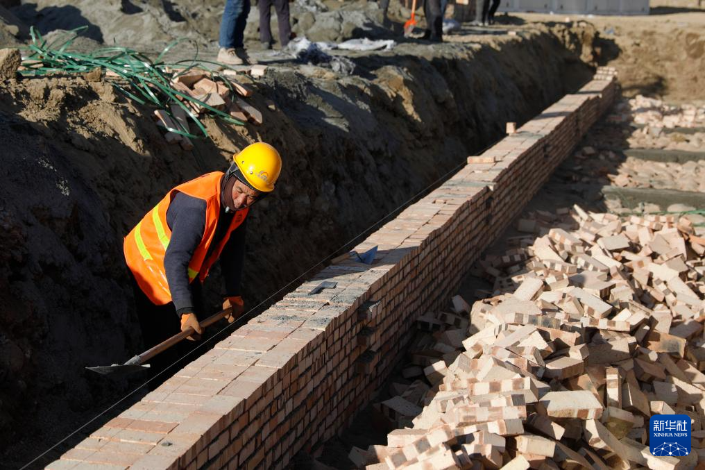 12月27日,在积石山县吹麻滩镇集中安置点,甘肃省公航旅集团施工人员在建造安置点公共厕所。新华社记者 方欣 摄