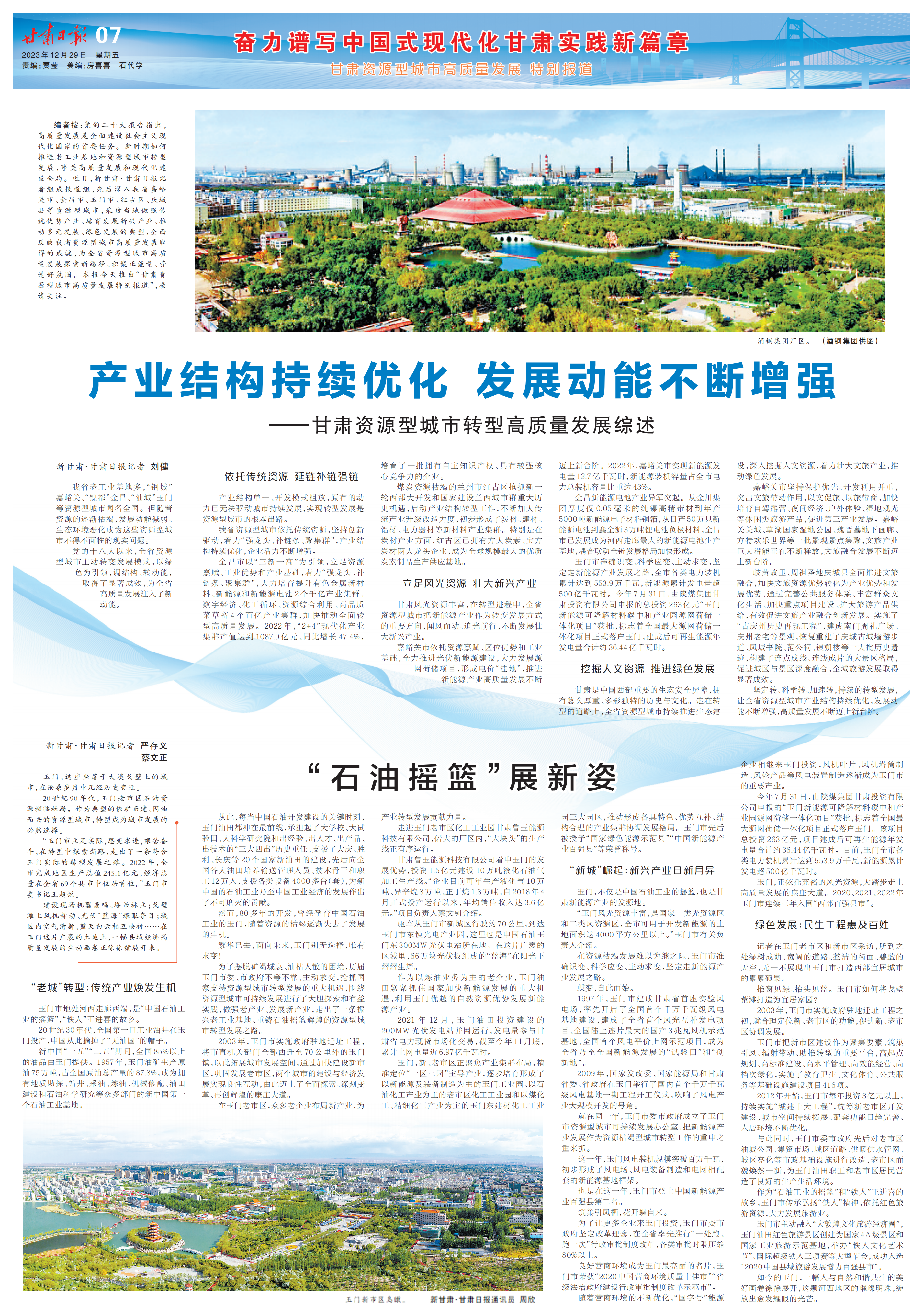 “玉门市立足实际,思变求进,艰苦奋斗,在转型中探索新路,走出了一条符合玉门实际的转型发展之路。2022年,全市完成地区生产总值245.1亿元,经济总量在全省69个县市中位居首位。”玉门市委书记王超说。