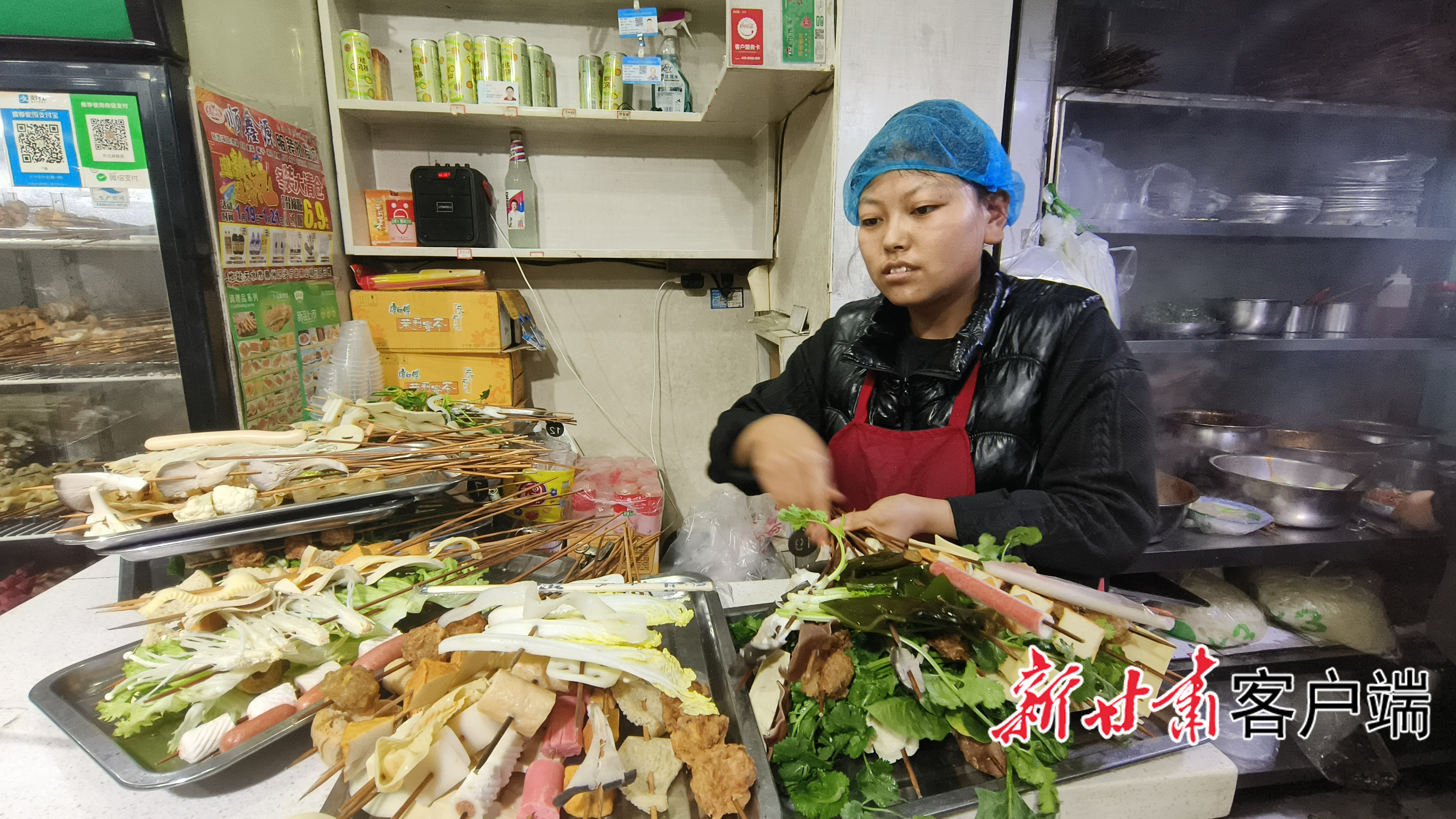 记者随机来到位于天水市秦州区大众路的一家麻辣烫店,虽然已经过了饭点,但是排队吃麻辣烫的食客依然络绎不绝。每个人手里都握着一大把串好的食材,耐心地等待着。而一旁的食材柜前也围满了取菜品的食客。